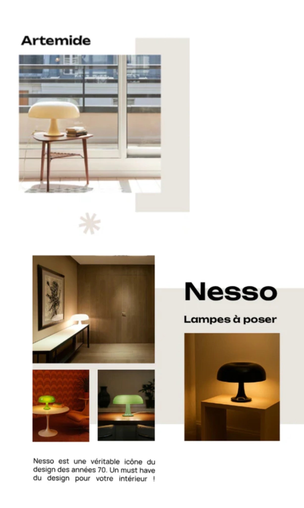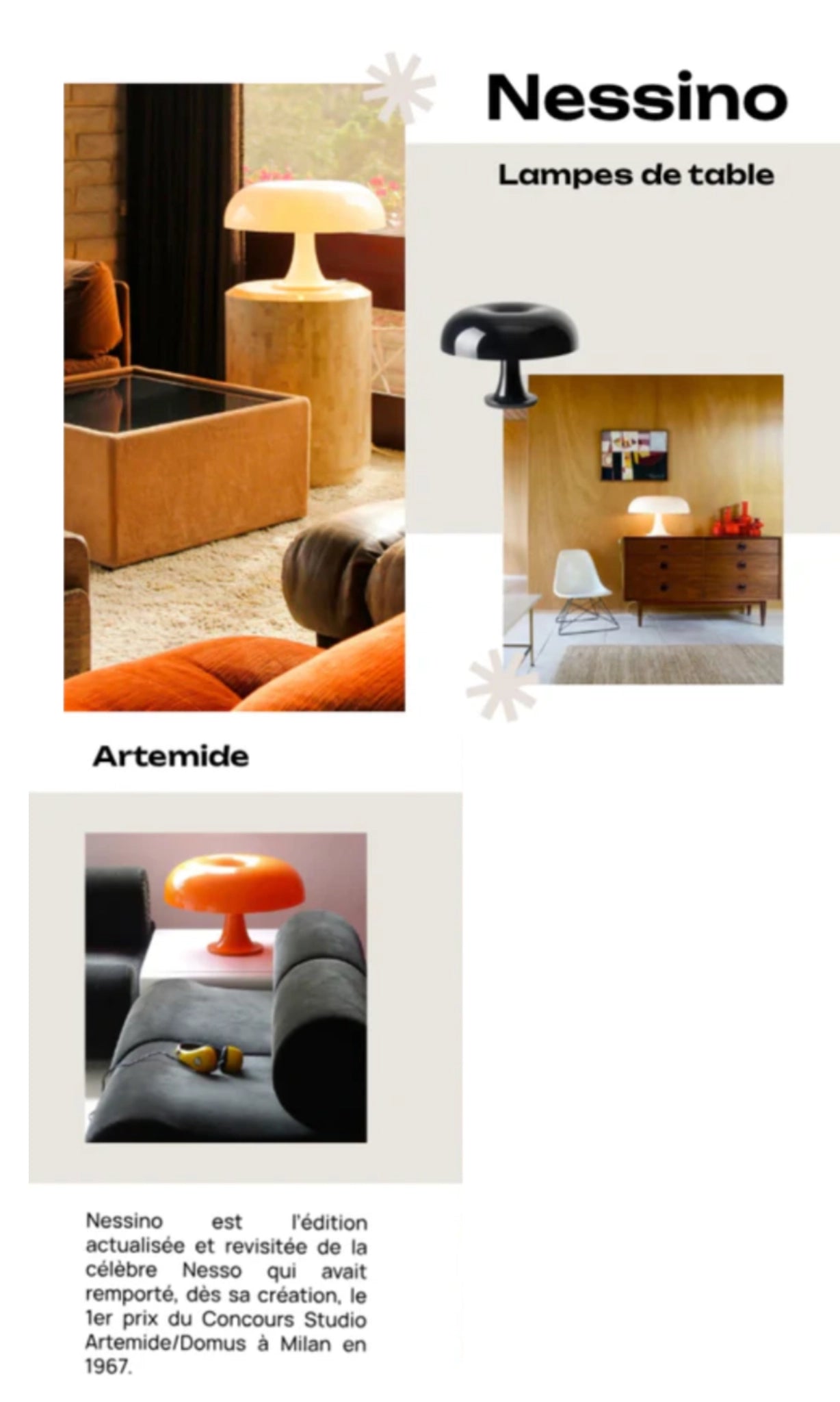 La lampe Nessino a été créée par Giancarlo Mattioli et le Gruppo Architetti Urbanisti Città Nuova, collectif à l’origine de plusieurs créations emblématiques du design italien. Lorsqu’elle apparaît pour la première fois à Milan en 1965, la lampe à poser Nesso par Artemide s’impose immédiatement comme une rupture esthétique majeure notamment grâce à sa couleur d'origine : le orange. Cette lampe à poser en forme de champignon orange – devenue depuis iconique – exprime à la fois simplicité, modernité et audace sculpturale. La lampe Nesso, ancêtre de la Nessino, a remporté le premier prix du Concours Studio Artemide/Domus à Milan en 1965, une distinction qui a marqué le début de sa carrière comme icône du design italien.. Plus qu’un simple produit, cette lampe symbolise la volonté de la marque Artemide de transformer la lumière en véritable élément de mobilier contemporain. La lampe Nesso, dont la Nessino est la réinterprétation contemporaine, fait d'ailleurs partie des collections permanentes du Museum of Modern Art (MoMA) de New York, soulignant son statut d’icône du design international.