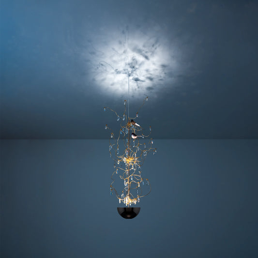 Prenons pour exemple l’une des plus incroyables créations du studio, la suspension LED Louis XIV Or poli. Cette suspension absolument unique en son genre se décline par 75 gouttes de cristal ainsi que par deux oiseaux perchés qui se dévoilent sur de fines branches en laiton naturel. Irrévérencieuse, audacieuse, magnifique, cette suspension incarne un véritable parti pris du créateur. Ce luminaire Davide Groppi est directement inspiré du lustre classique, tout en évinçant le communément attendu. Exceptionnel, rien de moins.