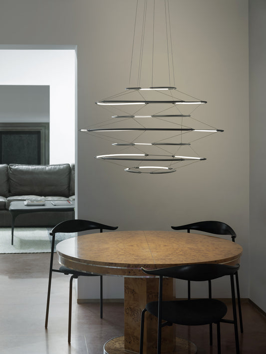 De cette manière, les suspensions multiples sont idéales pour les vastes hauteurs sous plafond : elles pourront alors éclairer et sublimer une descente d’escaliers, un salon au plafond cathédrale ou encore une cuisine aux volumes généreux. Offrez-vous ainsi une cascade lumineuse du plus bel effet avec des créations telles que la composition de 6 suspensions Nevo compo medium par ARTURO ALVAREZ, offrant beaucoup de légèreté grâce à une maille en acier douce et chaleureuse. Dans le même esprit, découvrez la suspension Mizu 5 par TERZANI, inspirée par la lumière tranquille et envoûtante des reflets créés par l'eau et offrant d’incroyables reflets sur les surfaces environnantes.