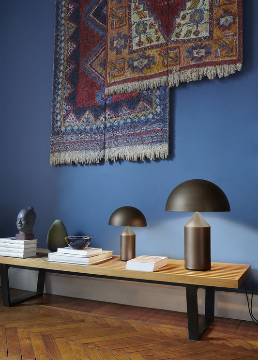 En or, en blanc, en noir, en bronze ou en blanc mat, la lampe Atoll s’associe à n’importe quelle décoration, apportant un style moderne à la lampe de table grâce à ses formes géométriques qui reprennent pourtant les formes d’une lampe comme on se l’imagine. Avec une demi-sphère pour l’abat-jour et un cylindre surmonté d’un cône pour la base, cette œuvre d’art se présente autant comme un luminaire qu’une pièce contemporaine et artistique.