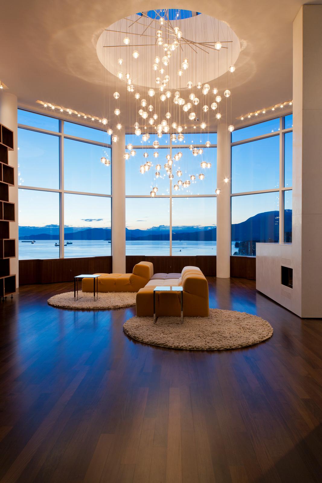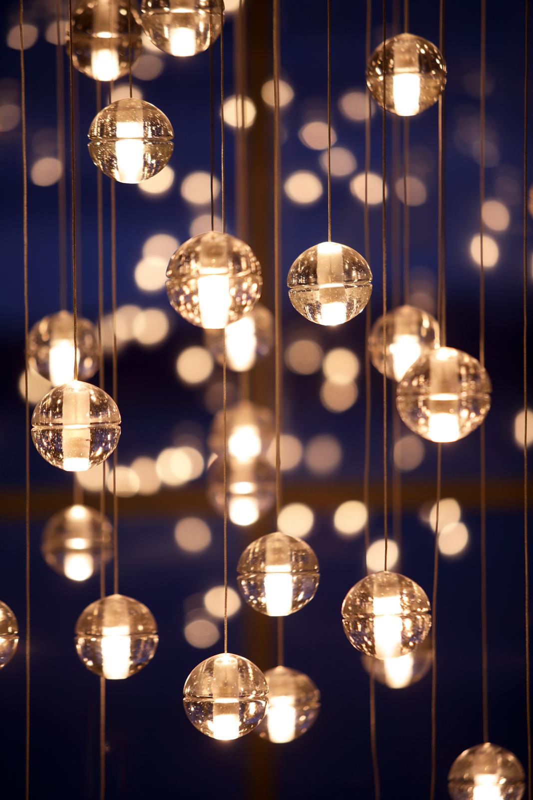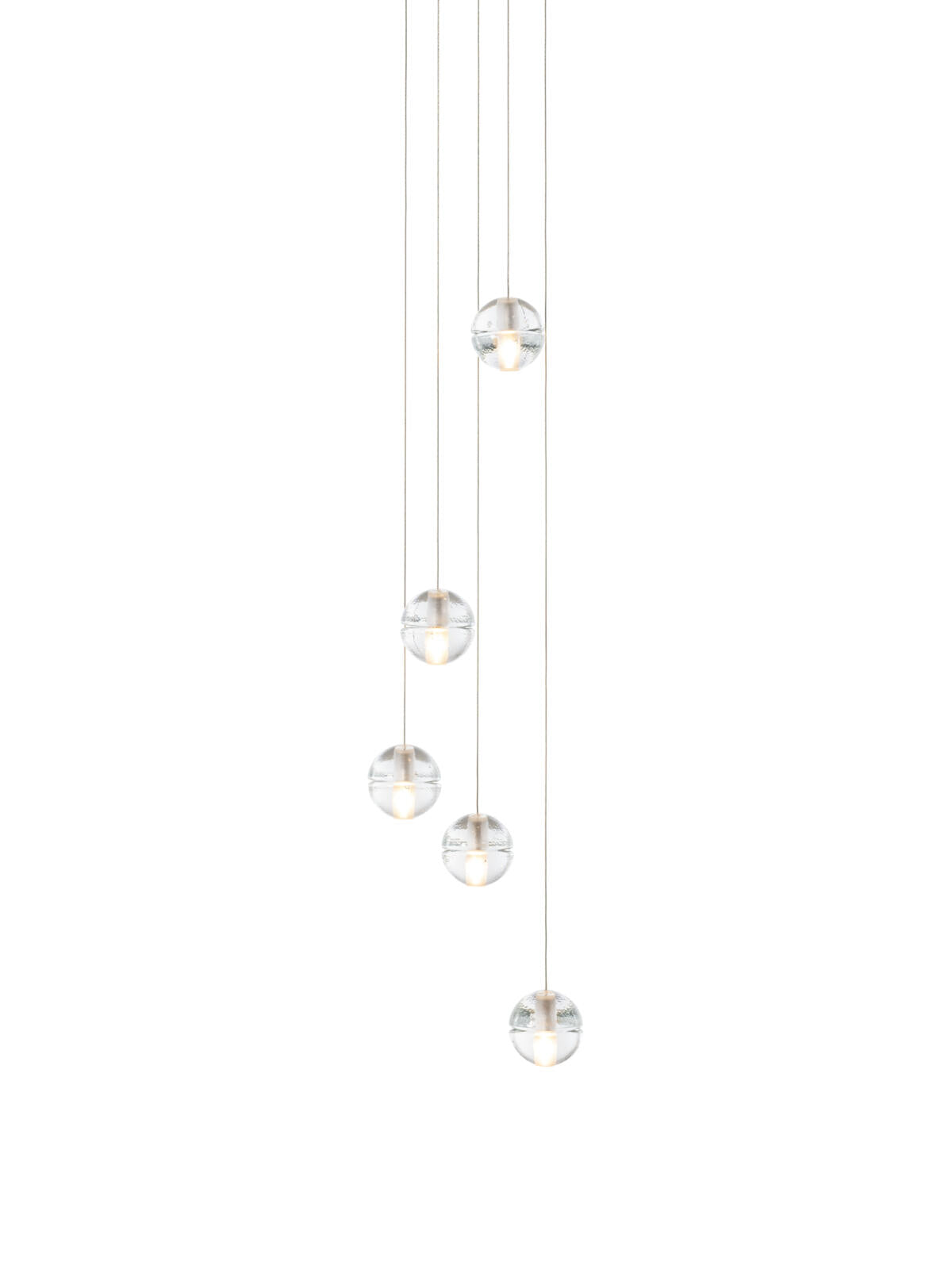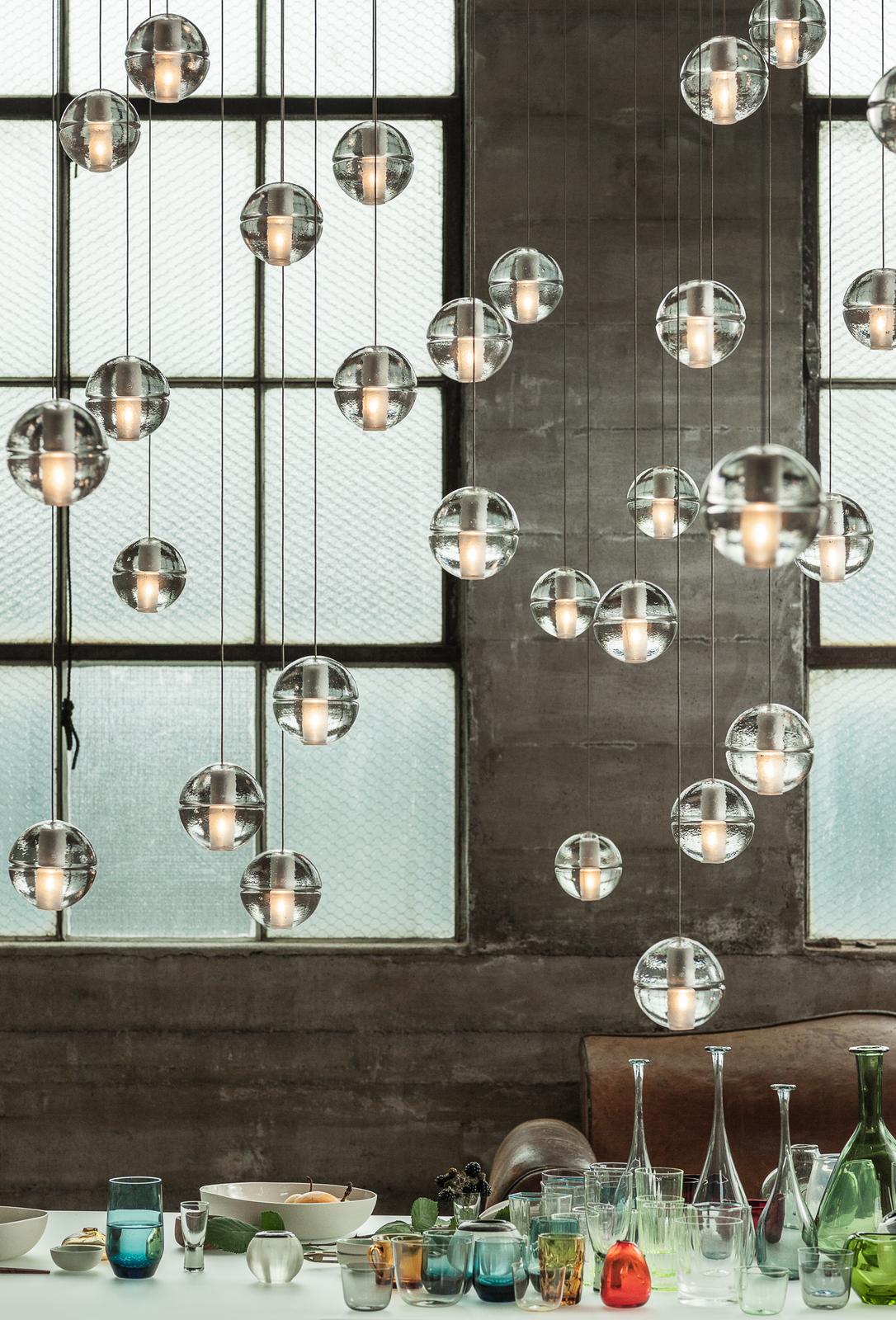 La série 14 se décline en cascades, à adapter selon votre espace et votre hauteur sous plafond. Le verre est coulé dans un moule hémisphérique. Lorsque le verre se refroidit, une forme de ménisque se forme sur la face ouverte de la pièce. Deux de ces pièces sont jointes pour former une sphère articulée, les deux vides au milieu donnant une certaine qualité optique. Un vide cylindrique traverse les deux hémisphères et abrite une source de lumière.