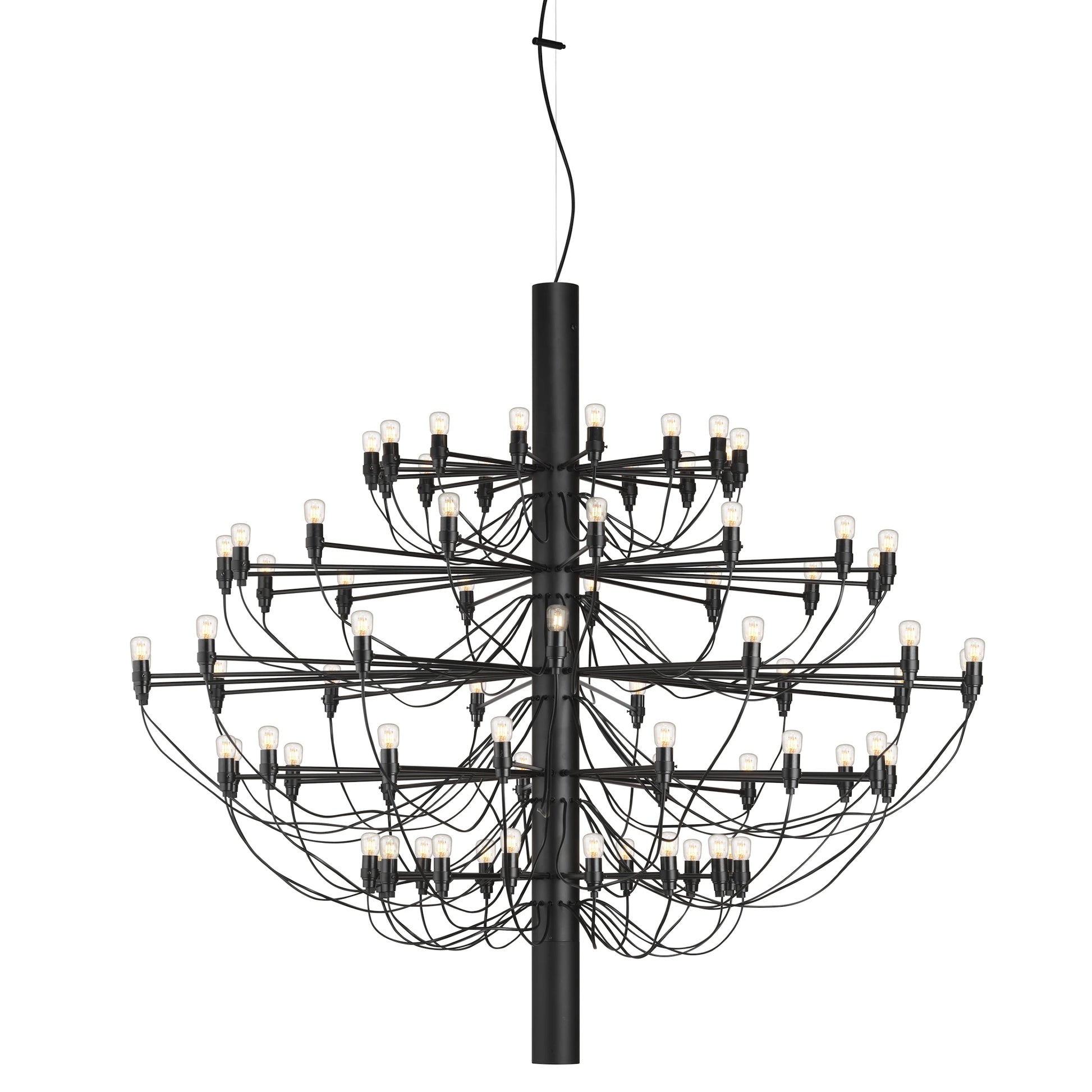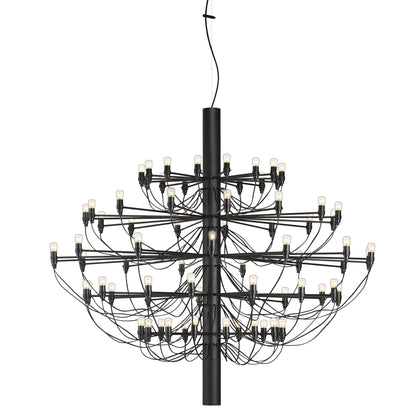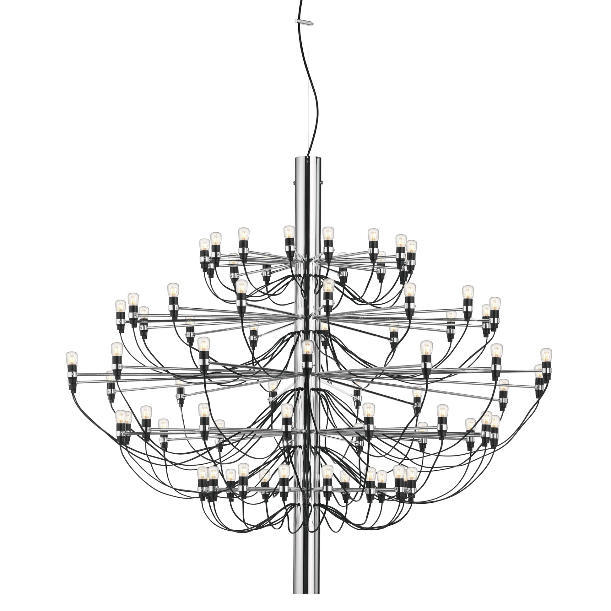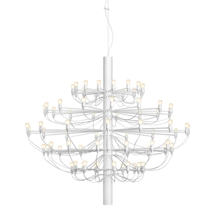 Suspension offrant un éclairage diffus. Structure centrale en acier avec bras en laiton, disponibles en finition chromée, noir mat, blanc mat ou dorée. Fixation et platine au plafond en acier.