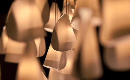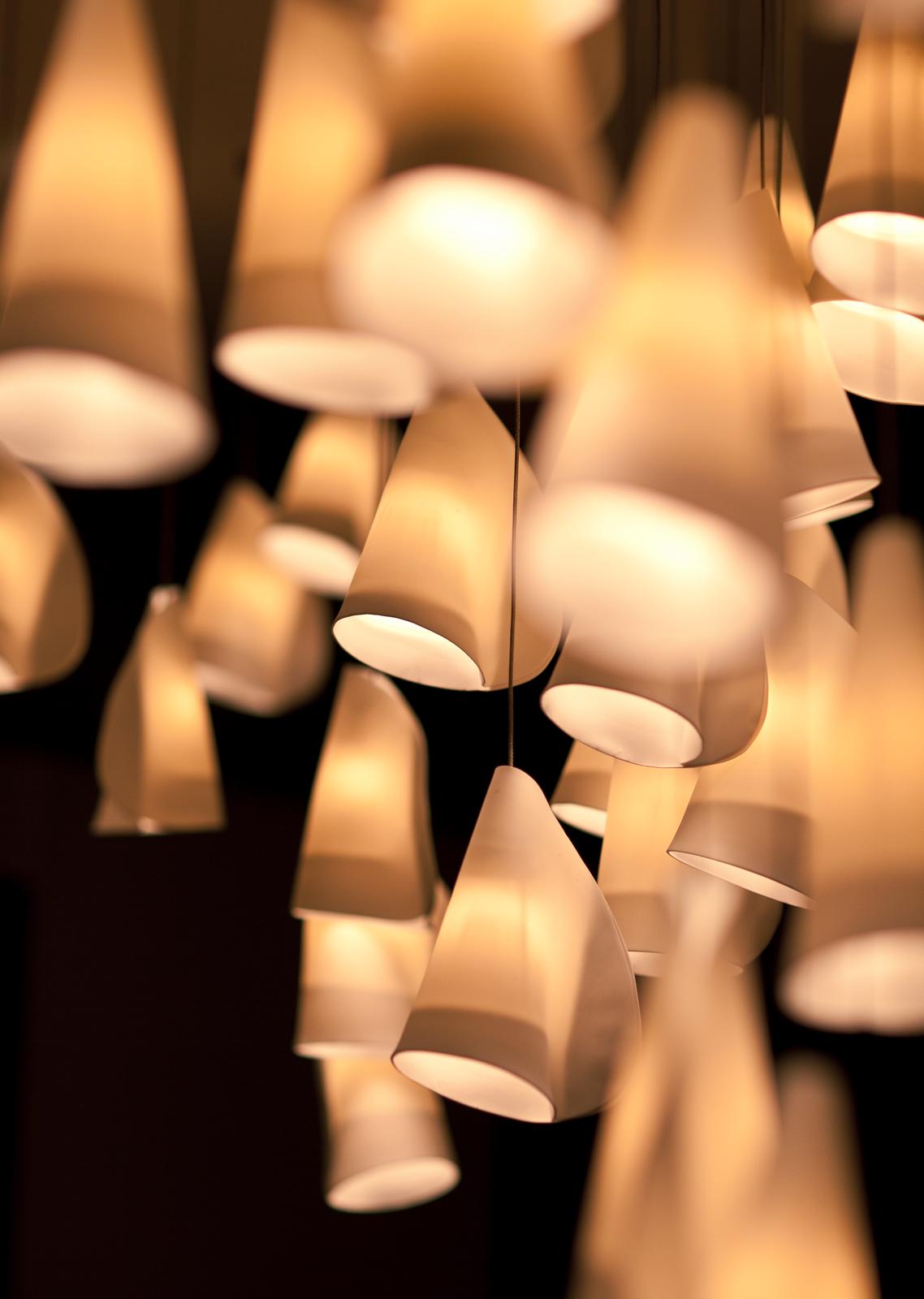 De fines feuilles de porcelaine sont drapées sur un diffuseur inversé en verre borosilicaté sablé. La fine peau de porcelaine habille ainsi le noyau de borosilicate sous quelque forme que ce soit, créant une forme unique à chaque fabrication.