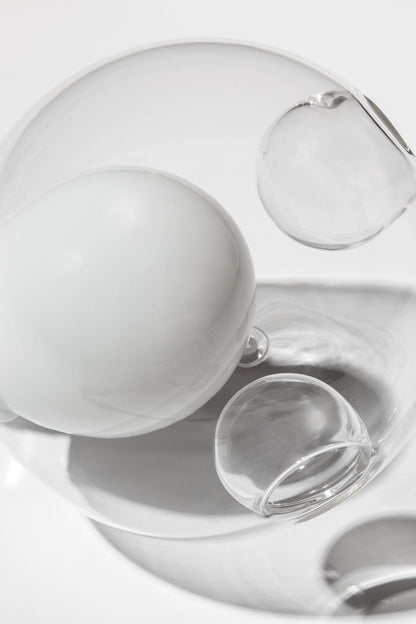 La série 28 de Bocci se décline en cascade ou en bouquet selon ses besoins et surtout sa hauteur sous plafond. Ici, les câbles sont réglables au moment de l'installation. 28 résulte d'un processus de fabrication innovant qui manipule à la fois la température et la direction du flux d'air dans le verre soufflé. Le résultat est une sphère légèrement déformée composée de formes satellites, y compris un diffuseur en verre laiteux opaque qui abrite l'ampoule.