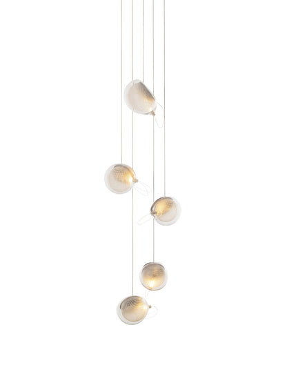 Formé en introduisant un espace vide dans une strate composée de verre blanc chaud et transparent, dans laquelle est insérée une maille de cuivre. L'espace e vide amène la couche blanche à se retirer à travers le maillage intégré, laissant de nombreuses vrilles de verre blanc suspendues dans un espace interstitiel. Sublime!