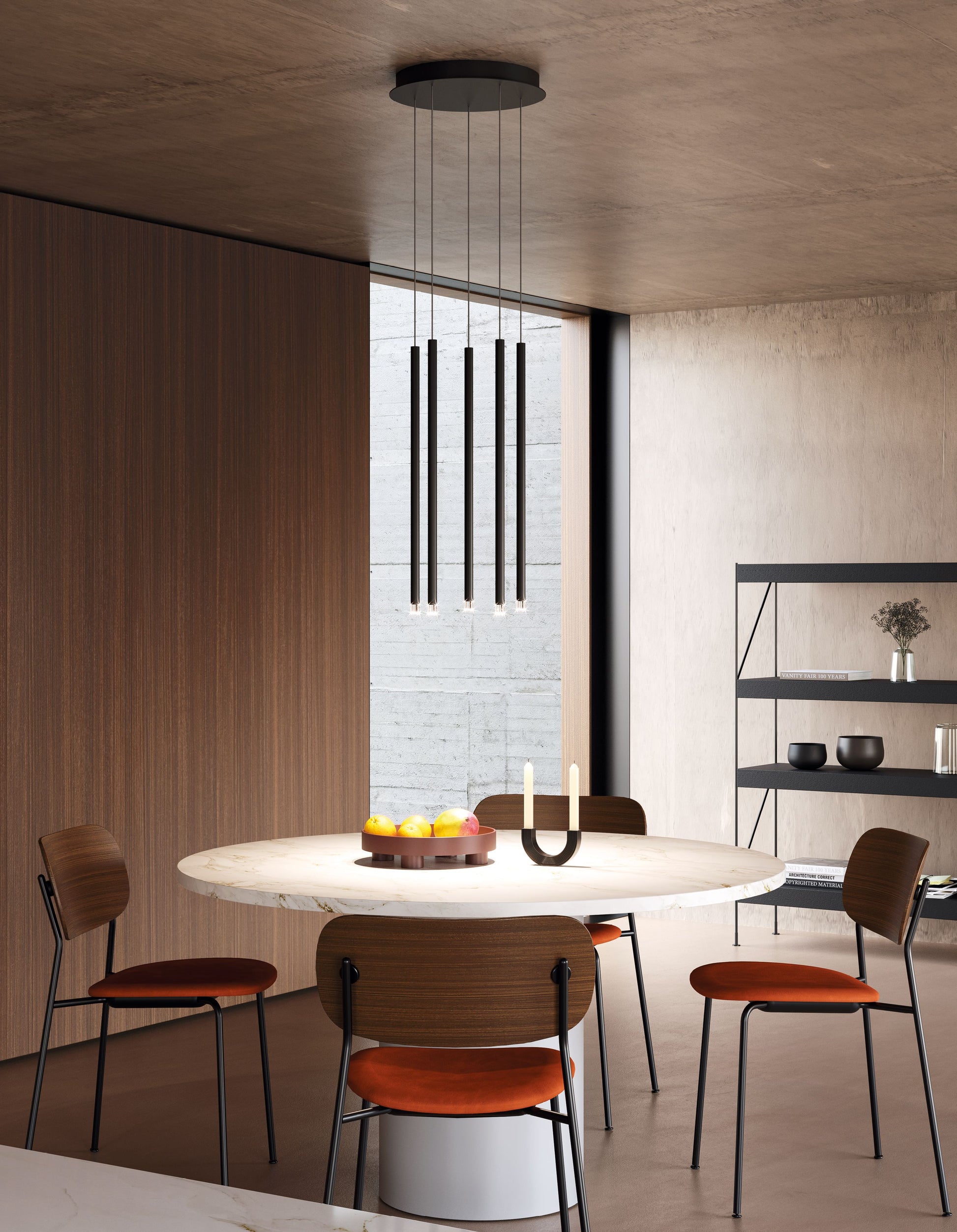La suspension A-Tube Nano rend la lumière de manière minimaliste en créant de fines lignes de lumière dans l'espace. Sous la structure légère en aluminium se trouve un diffuseur en méthacrylate transparent abritant un module LED qui émet une lueur douce et enveloppante. Disponible en 7 finitions et 3 tailles, vous pouvez mélanger et assortir pour créer votre propre composition.