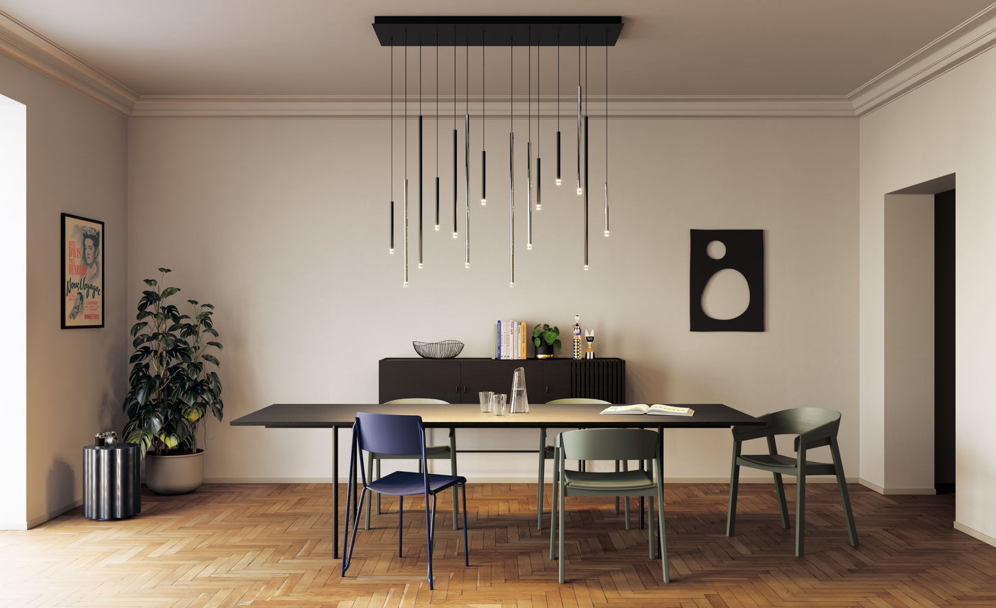 La suspension A-Tube Nano rend la lumière de manière minimaliste en créant de fines lignes de lumière dans l'espace. Sous la structure légère en aluminium se trouve un diffuseur en méthacrylate transparent abritant un module LED qui émet une lueur douce et enveloppante. Disponible en 7 finitions et 3 tailles, vous pouvez mélanger et assortir pour créer votre propre composition.