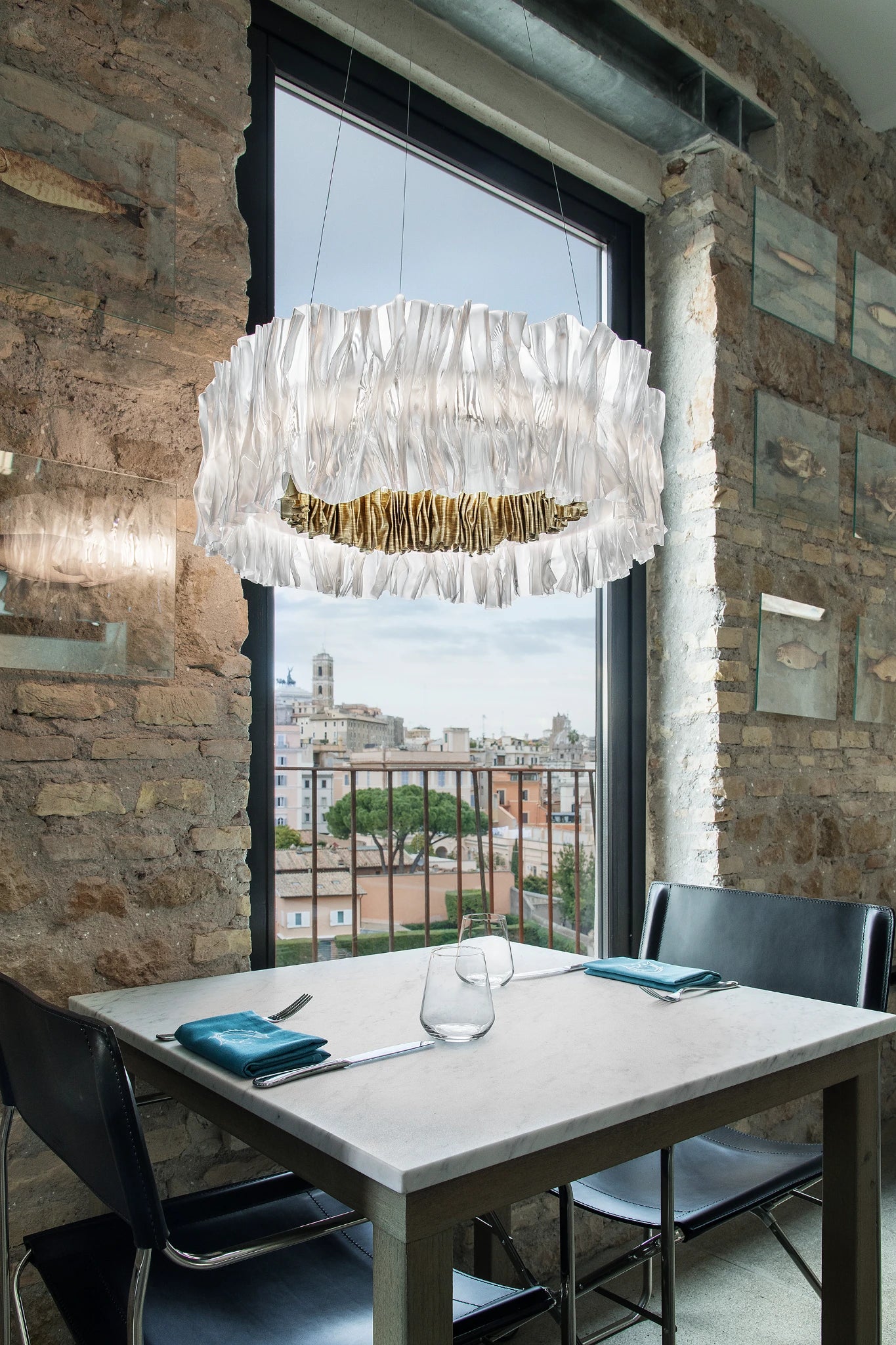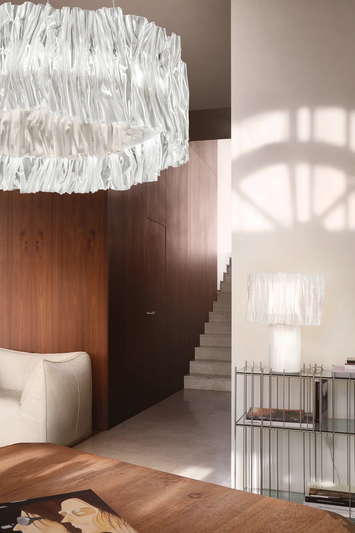 Fruit de l’exploration créative de Marc Sadler, la suspension Accordéon de Slamp est bien plus qu’un luminaire : c’est une pièce maîtresse qui fusionne design contemporain, inspiration textile et technologie avancée. Sa silhouette ondulée rappelle le plissé délicat d’un tissu haute couture ou le soufflet d’un instrument, d’où son nom évocateur.