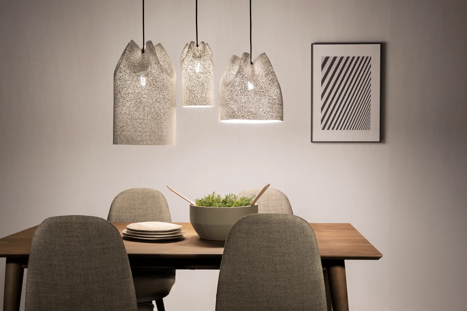 Agasallo, qui signifie « cadeau » en galicien, est la nouvelle collection d'Héctor Serrano. Ses formes et sa peinture à la main génèrent des effets de lumière uniques qui sont projetés dans l'espace créant une atmosphère unique. Disponible en quatre tailles de suspension pouvant être combinées à différentes hauteurs, Agasallo 1 est la plus petite suspension de la collection. C'est dans sa simplicité que réside son originalité. Agasallo est, sans aucun doute, un cadeau pour les sens, fait à la main en Espagne. Cette suspension existe en blanc, beige, gris ou taupe.