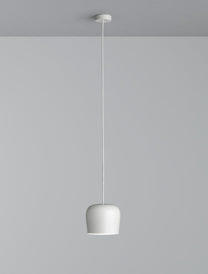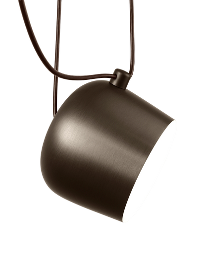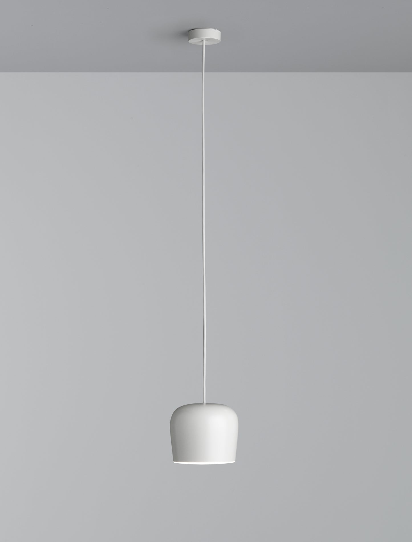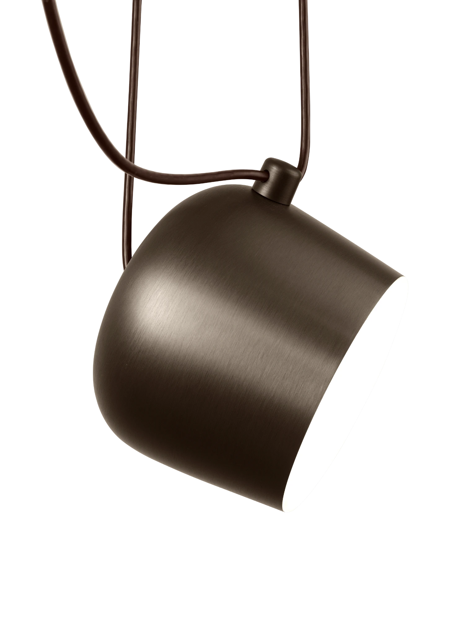 Corps en plaque d’aluminium tourné recouvert d’une peinture liquide, diffuseur en polycarbonate optique photogravé. Réflecteur interne en ABS photogravé. Corps orientable. Alimentation directe sur réseau. La longueur du câble utile est de 9 mètres, la lampe peut donc être suspendue à 3 mètres du plafond. Version à installer sur une sortie électrique standard plafond.