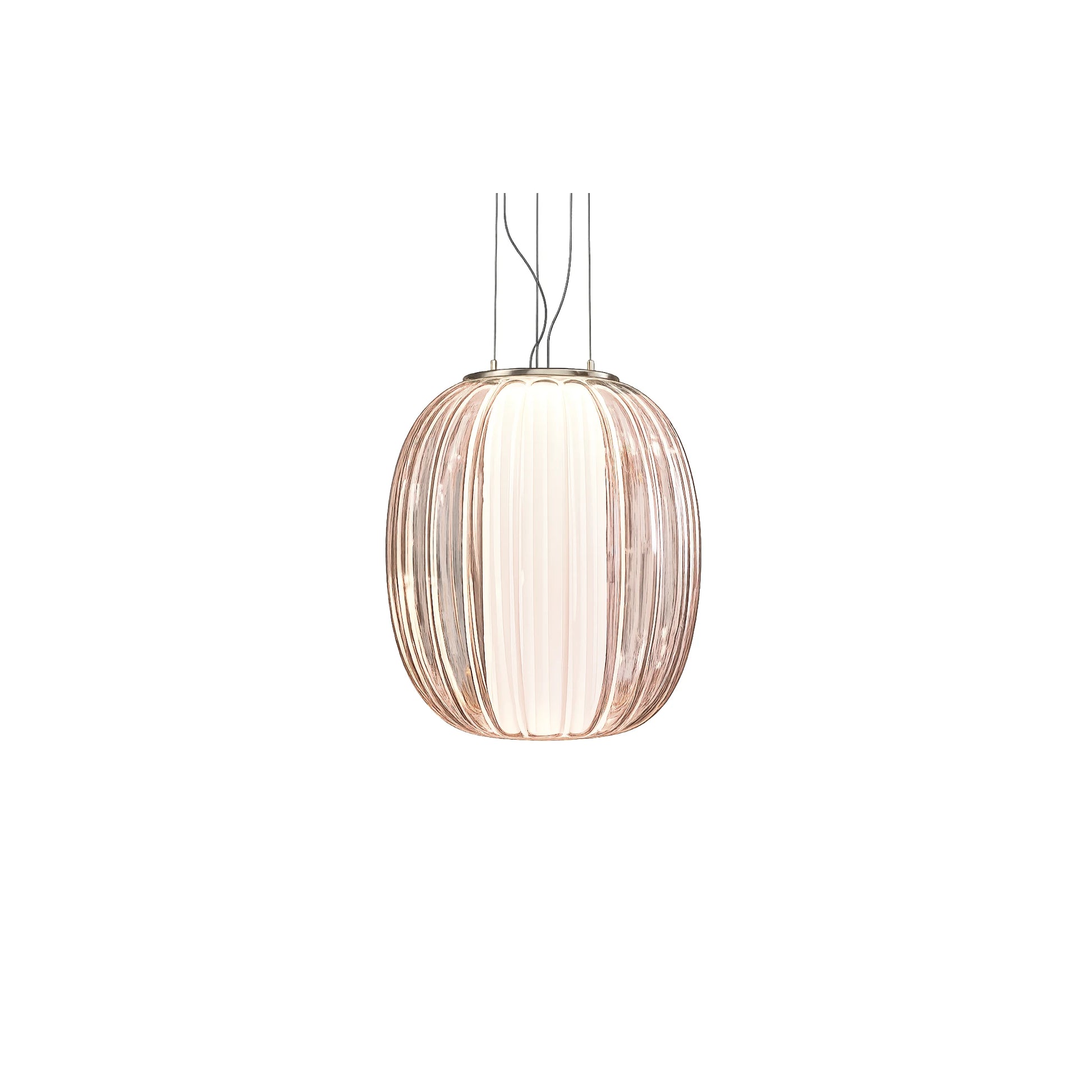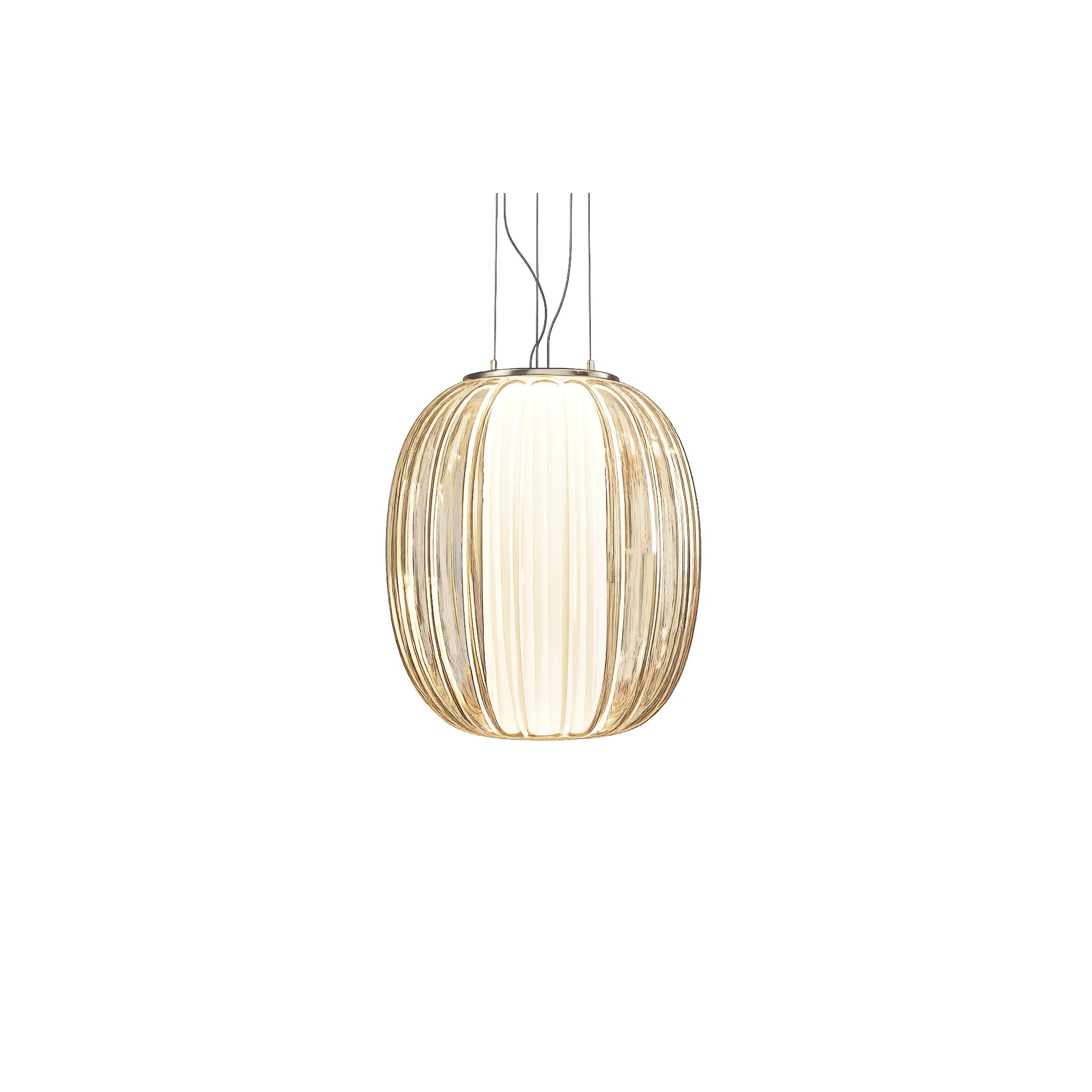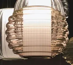 Le verre soufflé — disponible en amber, plum ou fumé — enveloppe délicatement le diffuseur intérieur en tissu plissé blanc. La lumière traverse ces différentes couches avec subtilité : le verre teinte et nuance l’émission lumineuse, tandis que le textile plissé l’adoucit pour créer une ambiance chaleureuse et maîtrisée. L’ensemble compose un équilibre précis entre transparence, texture et profondeur.