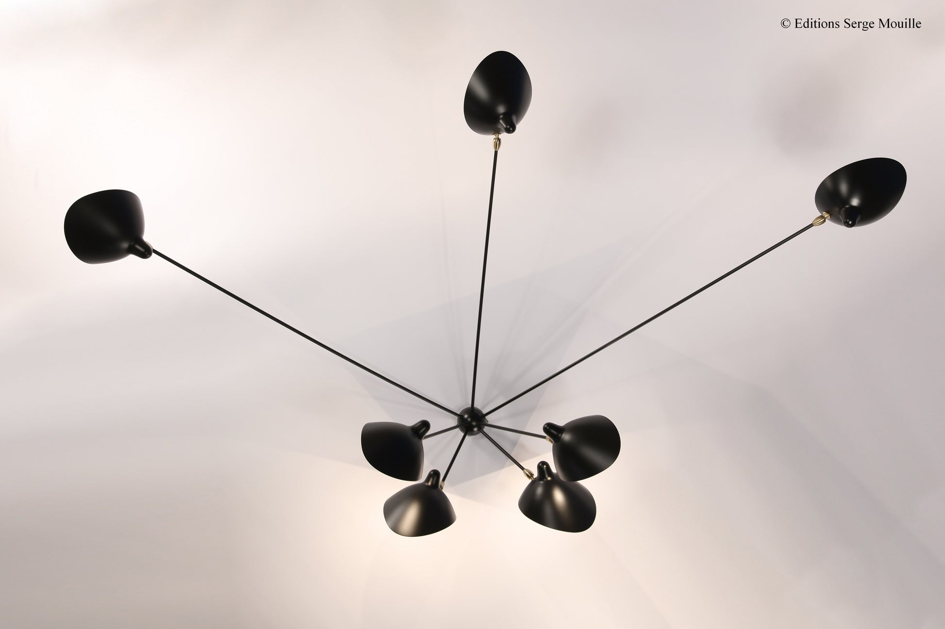 C’est la rencontre de Serge mouille avec Jacques Adnet, directeur de la Compagnie des Arts Français, en 1951 qui marquera un tournant dans sa vie. En effet, celui-ci lui demande de concevoir un ‘’grand luminaire’’ pour sa clientèle Sud-Américaine. Serge se met au travail et créé le Lampadaire trois bras, passant progressivement du statut de maitre-artisan à celui d’artiste créateur en développant la désormais célèbre série des Formes Noires. Le lampadaire trois bras, le lampadaire droit en seront les premiers modèles.