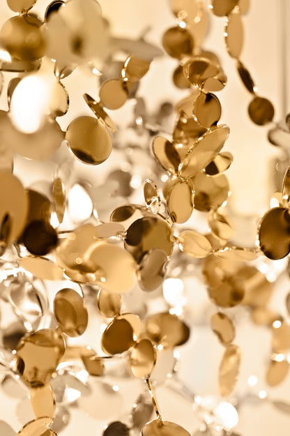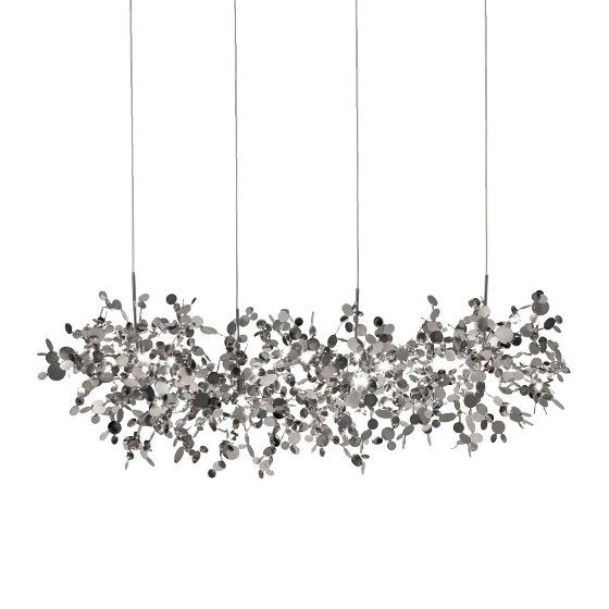 La collection Argent se compose de disques métalliques qui ont été méticuleusement soudés à la main par les artisans Terzani. Une fois éclairées, les surfaces multiples et inclinées des disques diffusent une lueur douce et chatoyante.