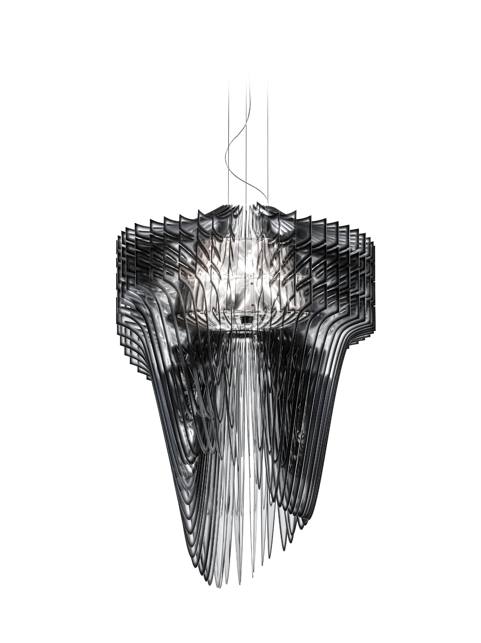 Pensée pour les grands volumes (Ø90 cm), cette version noire intense impose une présence architecturale forte, tout en diffusant une lumière dramatique et enveloppante. Aria ne se contente pas d’éclairer : elle transforme l’environnement en une expérience sensorielle et esthétique, entre ombre, transparence et géométrie fluide.
