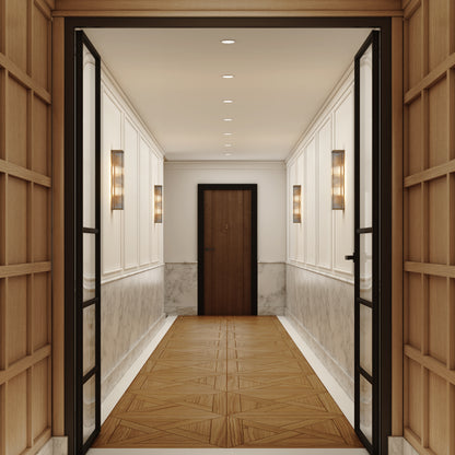 Inspirée des luminaires art déco, les imposantes dimensions de l'applique Avignon Round 500 font instantanément sensation, marquant tout espace de sa présence. Longue et filiforme, dotée d'un profil arrondi, elle se compose de tiges en verre transparent et étincelant et d'embouts en laiton ancien moulé sous pression. Elle émet un éclairage d'ambiance, sans éblouir. Pensée pour les environnements hôteliers, ce luminaire se fixe au mur via une seule vis discrète, afin que rien ne vienne détourner le regard de son esthétique uniforme.