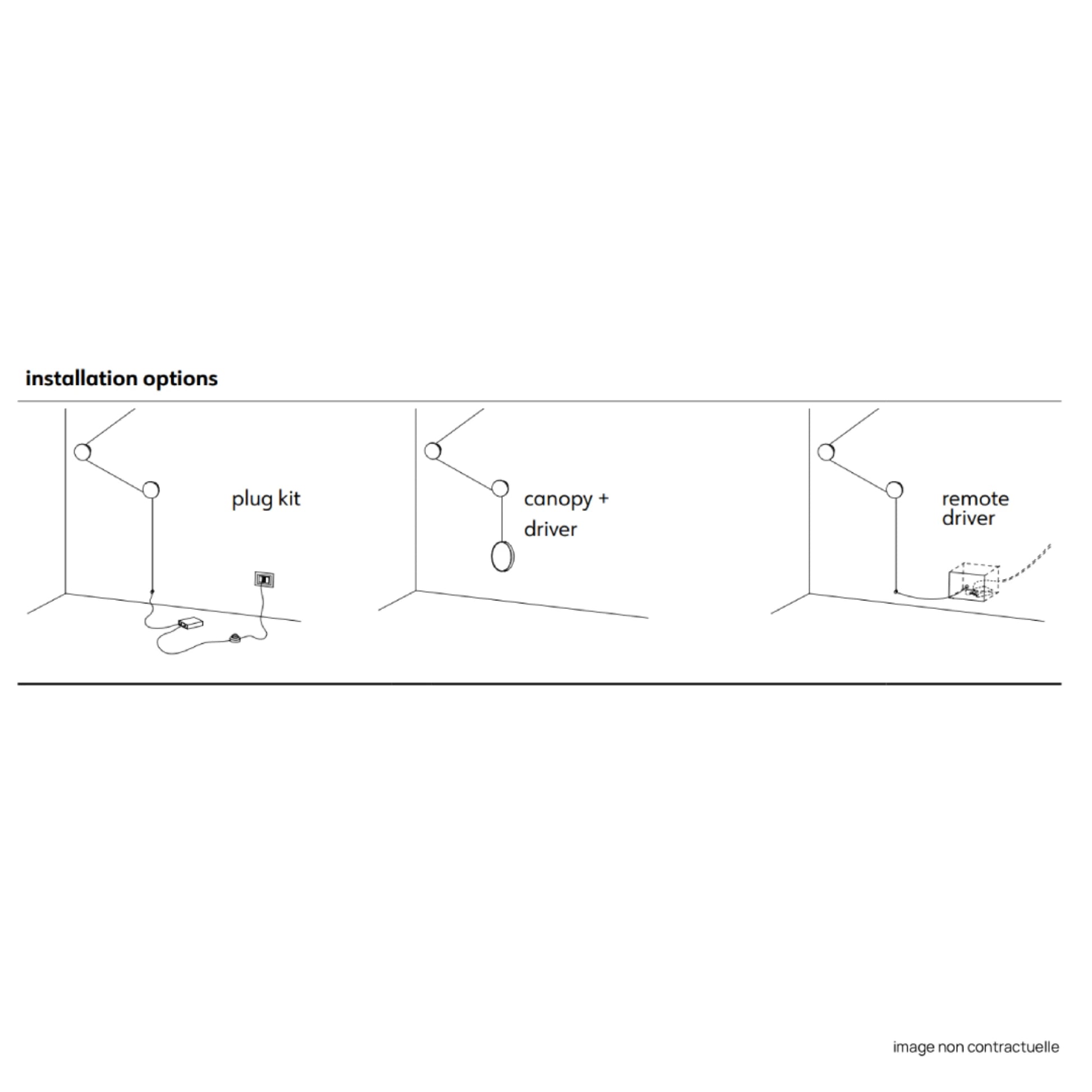 Important : pour une utilisation sur prise secteur le Plug kit (220-240V) pour Applique Azou est obligatoire. Pour une utilisation sur sortie électrique, veuillez ajouter la Platine Noir (sans driver) pour Applique Azou ainsi que le Driver dim. 1-10V ou push (220-240V) pour Applique Azou.
