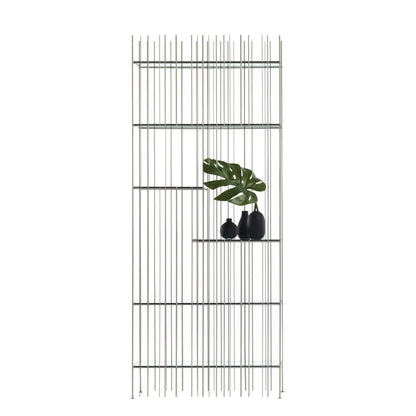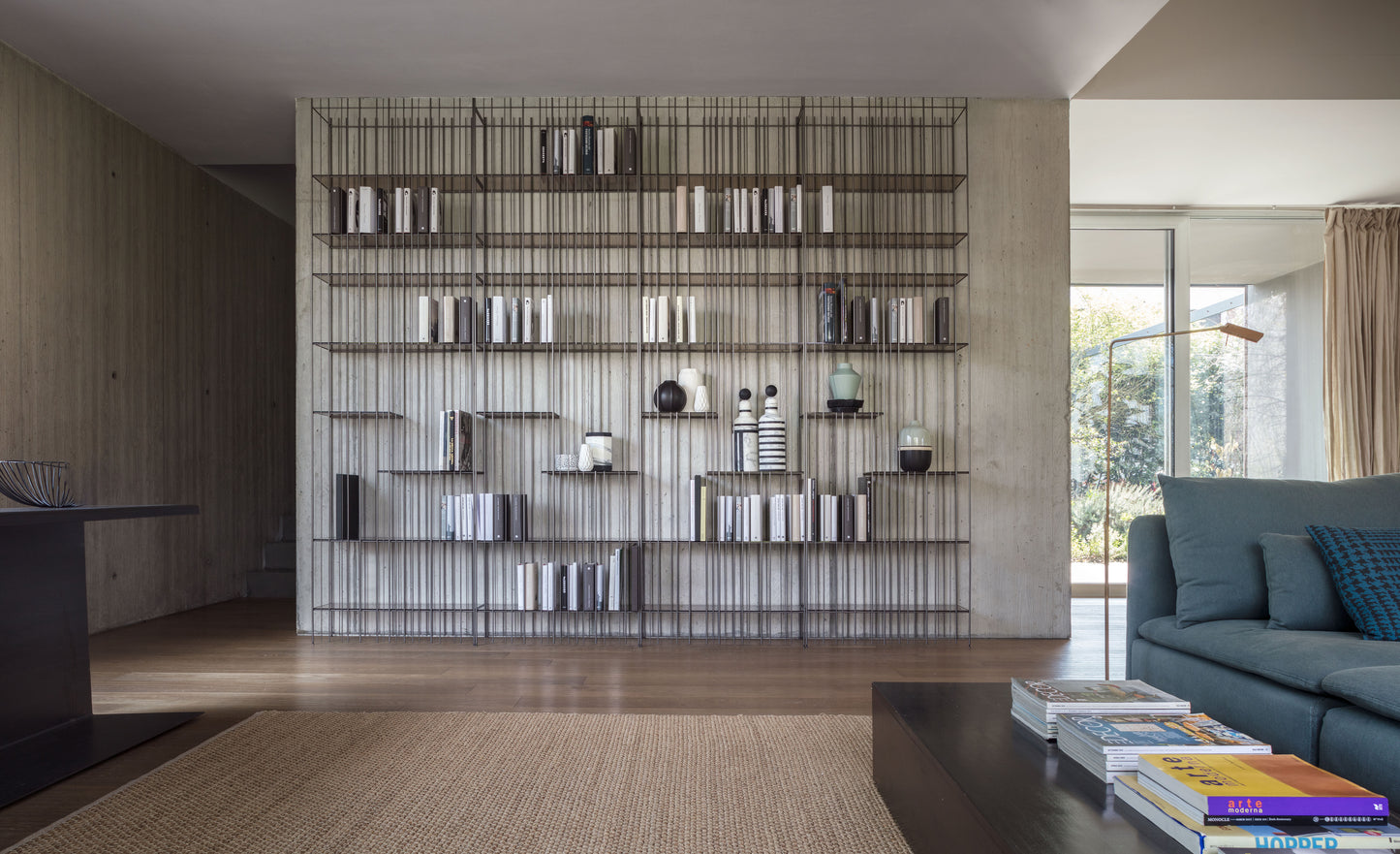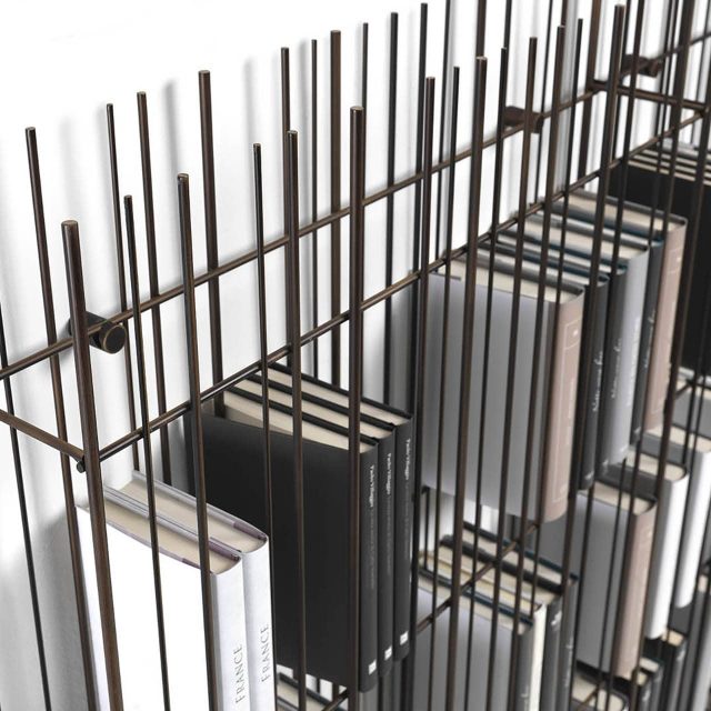 La structure est simple, le rythme est marqué par les tiges de fer fixées à différents intervalles sur une structure ouvertement rigoureuse à l'intérieur de laquelle les livres et objets insérés complètent la forme en écrivant de temps en temps de nouvelles compositions. Metrica est une bibliothèque en métal disponible dans les finitions titane, bruni et or avec des étagères en cristal transparent disponibles en bronze ou vert. Etagères fournies en Bronze, en vert sur demande.