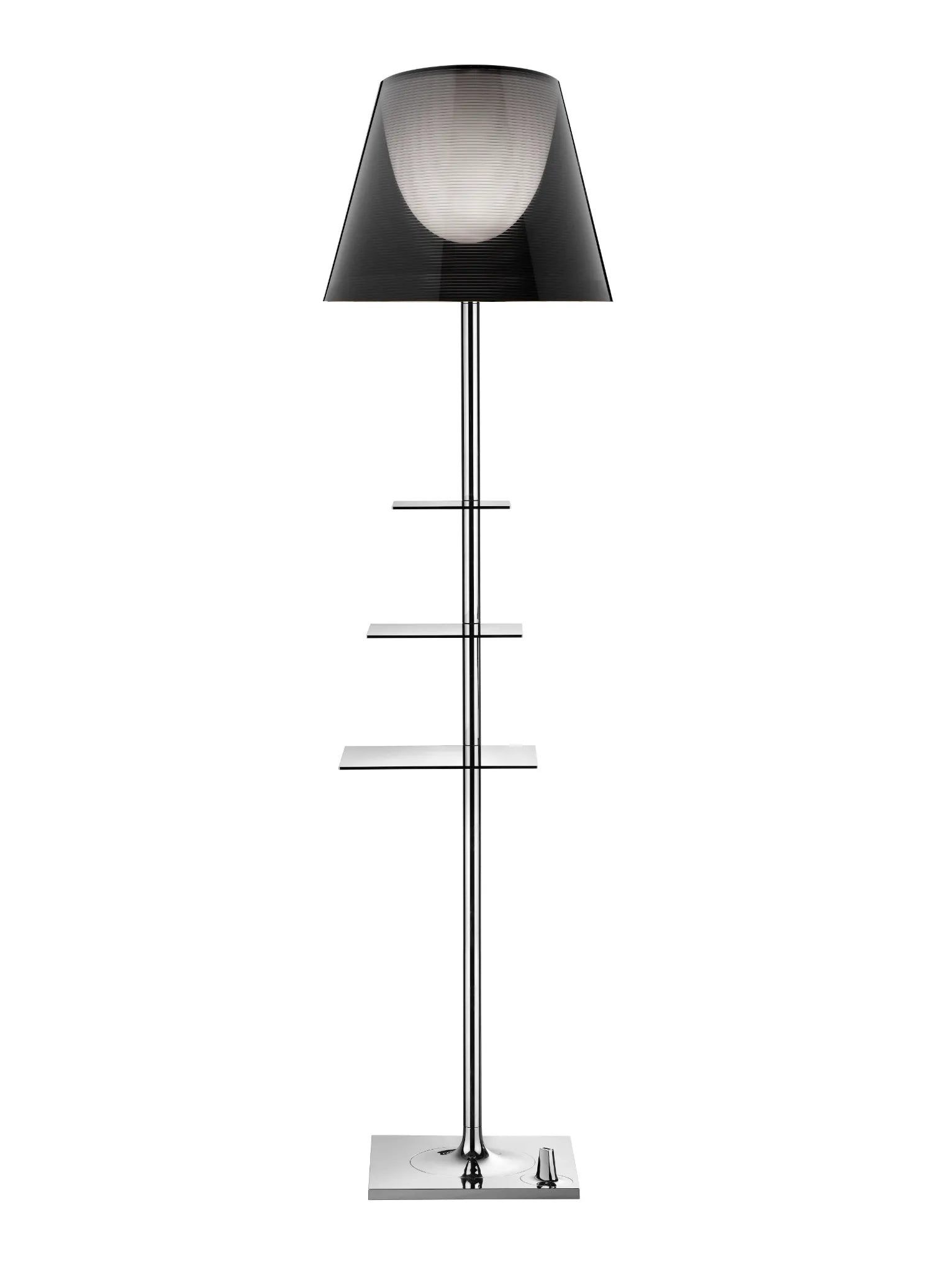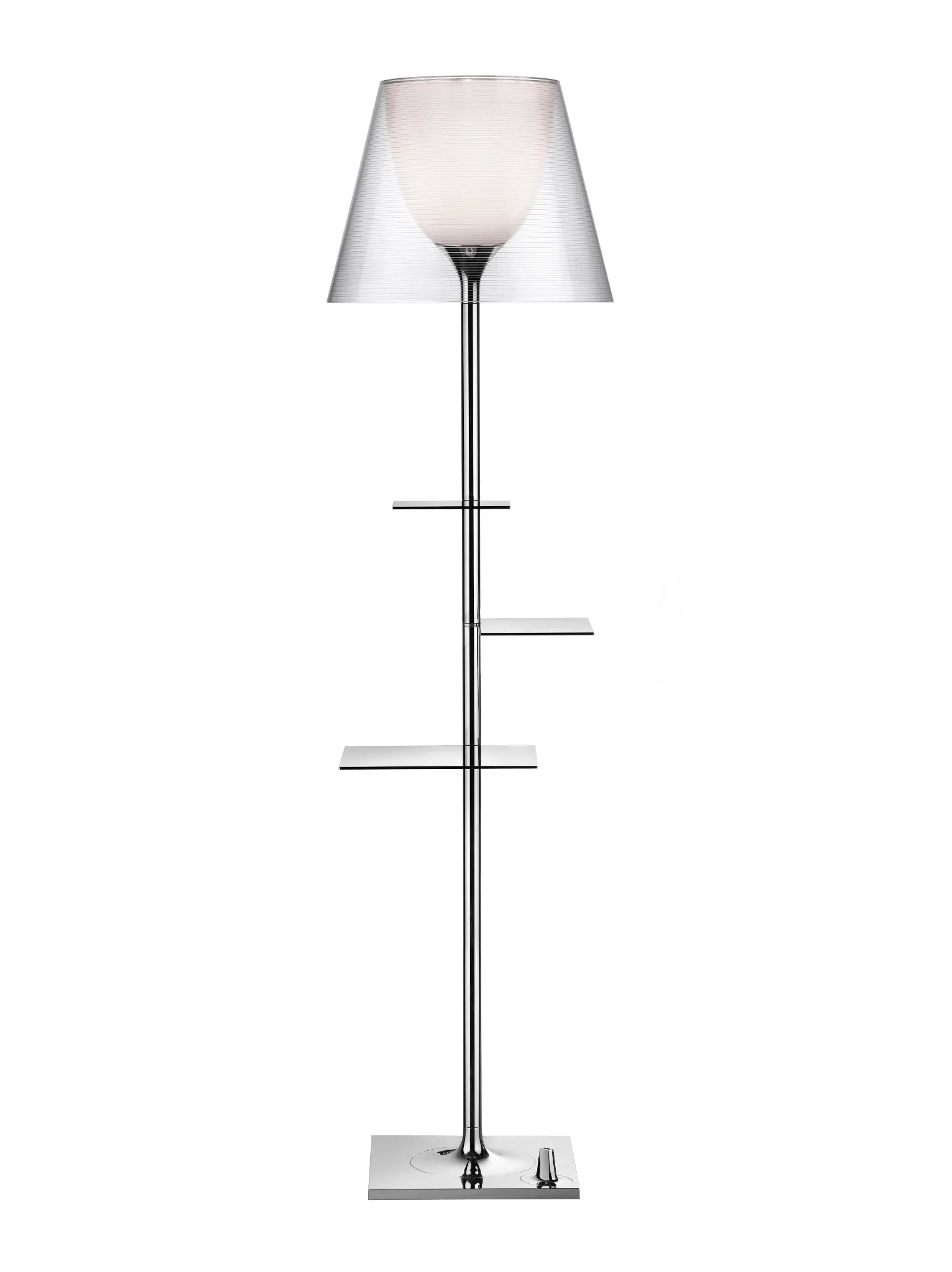 Base, support de tige et support de diffuseur en zamak moulé sous pression chromé. Couverture de la base en tôle d'acier P04 galvanisé. Diffuseur interne et support de douille en PC moulé par injection coloris opale. Les diffuseurs externes sont en tissu et PVC, en méthacrylate moulé par injection transparent ou gris fumé, ou métallisé gris ou métallisé bronze, avec face interne aluminium, selon un procédé d’aluminisation sous vide. Anneau supérieur en PC moulé par injection, transparent. Tablettes en acier inoxydable poli.