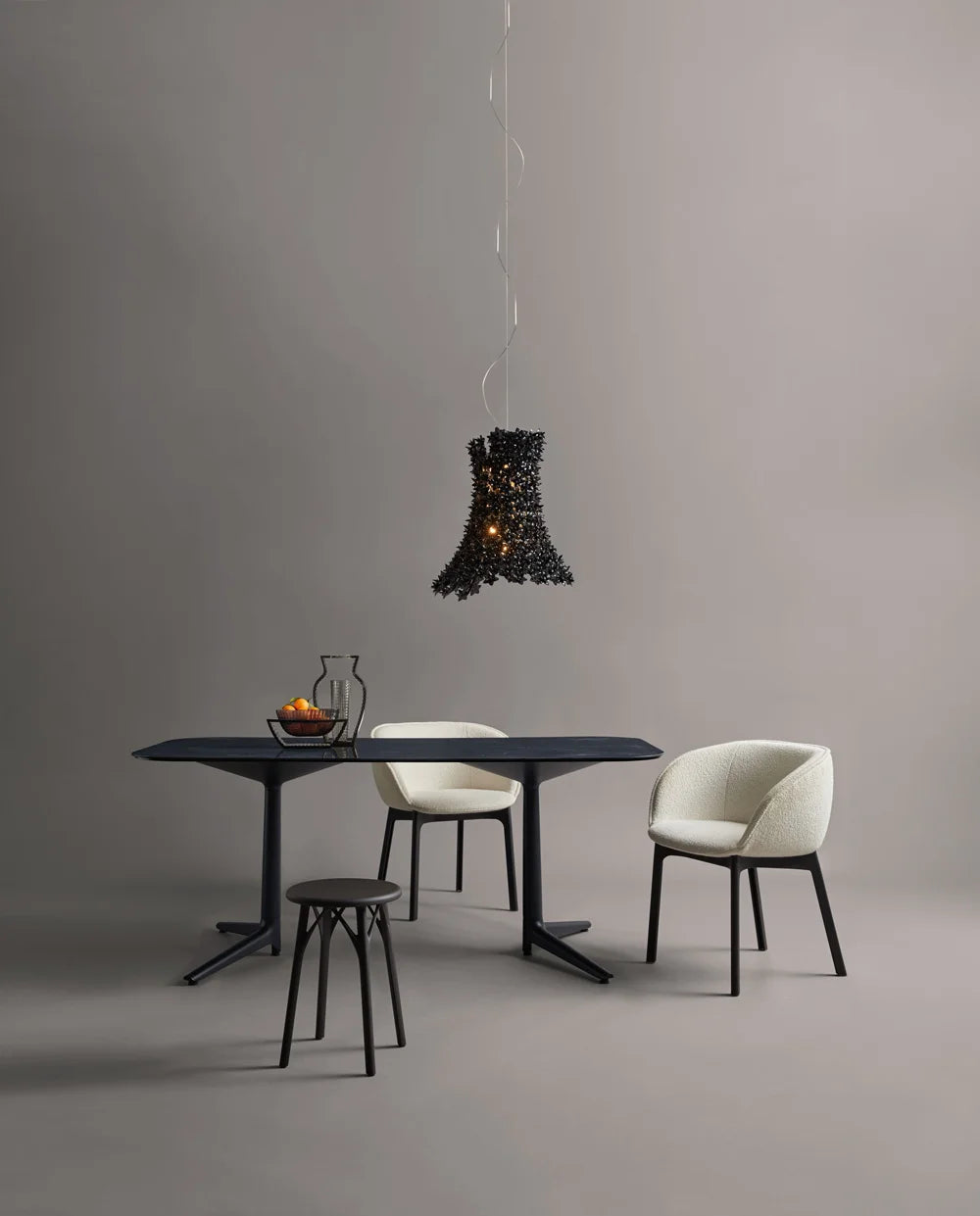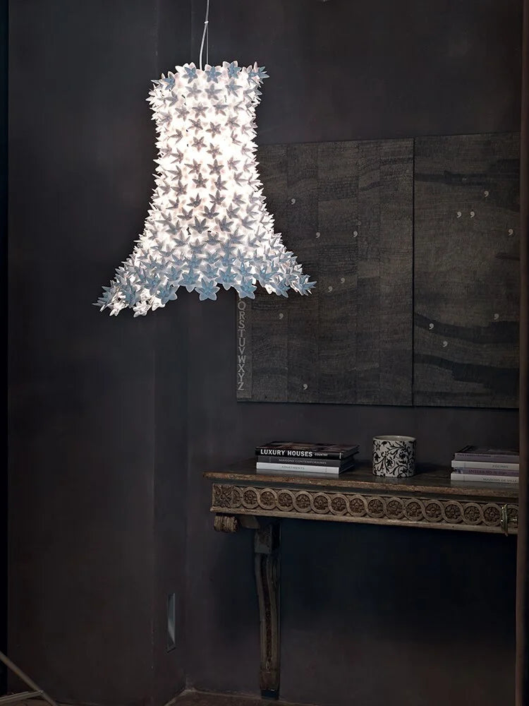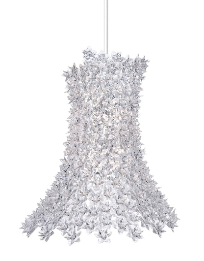 Bloom se compose d'un squelette tubulaire entièrement recouvert d'une structure formée de petites fleurs à double corolle en polycarbonate transparent. Le résultat est une lampe produite industriellement mais avec les formes et la complexité stylistique d'une pièce unique, artisanale. Des ampoules placées à l'intérieur de la structure diffusent, à travers les pétales, le faisceau lumineux qui se réfléchit sur les surfaces facettées des fleurs en donnant naissant à mille reflets. Attention: cette suspension mesure 70cm de haut, elle est donc recommandée pour des hauteurs sous plafond de 310cm minimum si vous passez en-dessous et de 280cm si elle est instalée au-dessus d'une table.