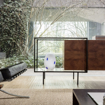 Le buffet Zoom et l'armoire Zoom sont des éléments de rangement avec la structure en MDF laqué dans toutes les couleurs selon la carte d'échantillons ou plaqué en plume d'acajou et structure en métal en noir ou bronze patiné. Les deux unités de stockage avec un design linéaire et géométrique avec des volumes ouverts et fermés. Élégantes et contemporaines, elles s'adaptent à tout environnement avec une identité distincte.