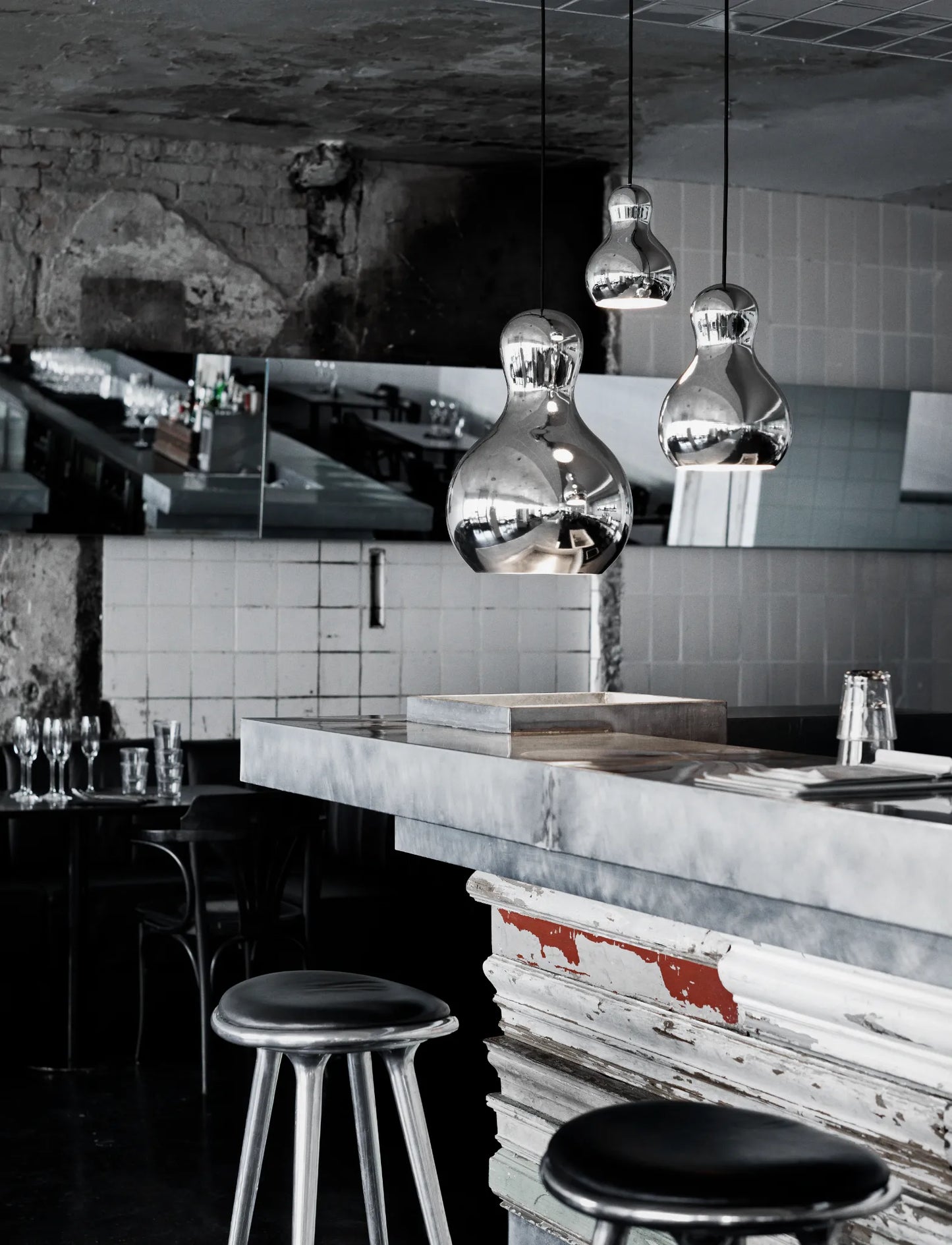 La suspension Calabash du studio Komplot Design est inspirée par la forme simple et harmonieuse de la calebasse. Réalisée en aluminium avec une finition chromée ou texturée mate, la suspension Calabash est un exemple d’artisanat authentique. Qu’elle soit allumée ou éteinte, la suspension Calabash, possède une présence forte, combinant les formes convexes et concaves, reflétant la pièce ou manifestant ce reflet par sa qualité sculpturale. Cette suspension est disponible en plusieurs tailles et plusieurs coloris.