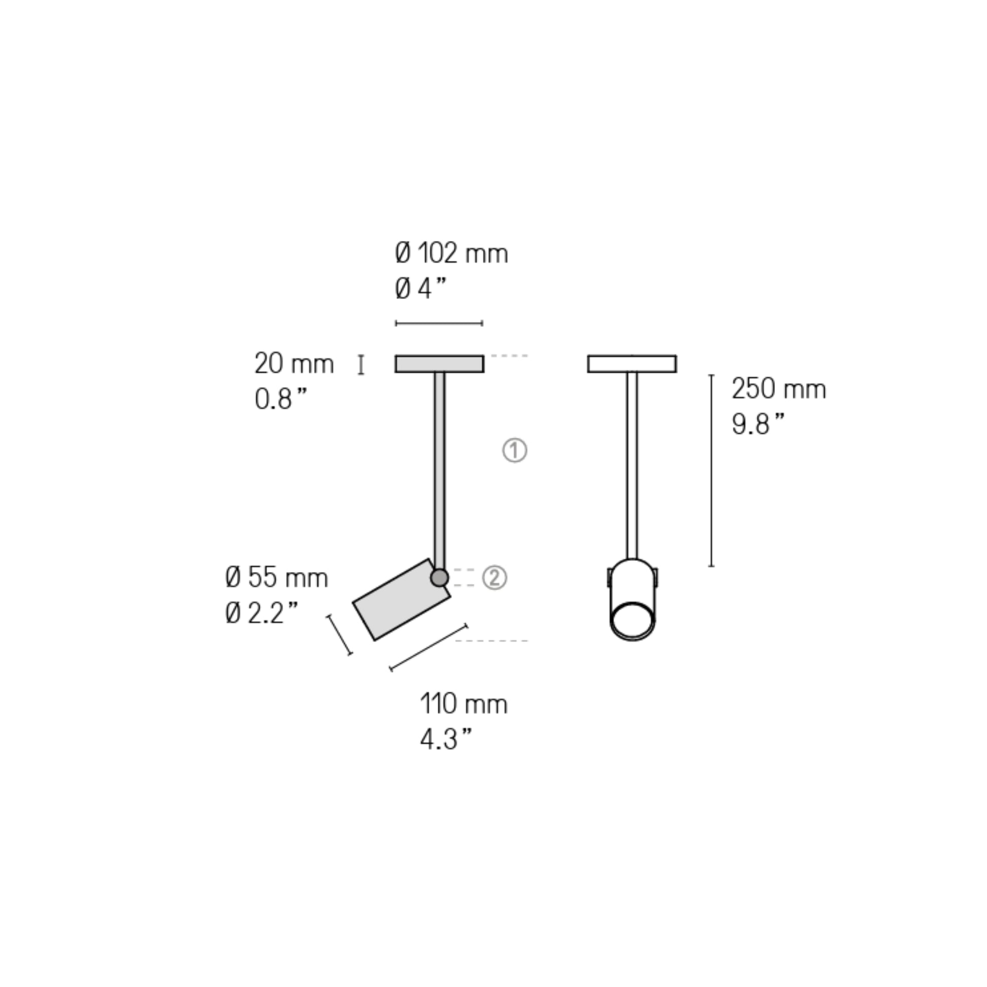 Dimensions: Ø 55mm - L 110mm - tige 250mm - base Ø 102mm - base Largeur 20mm