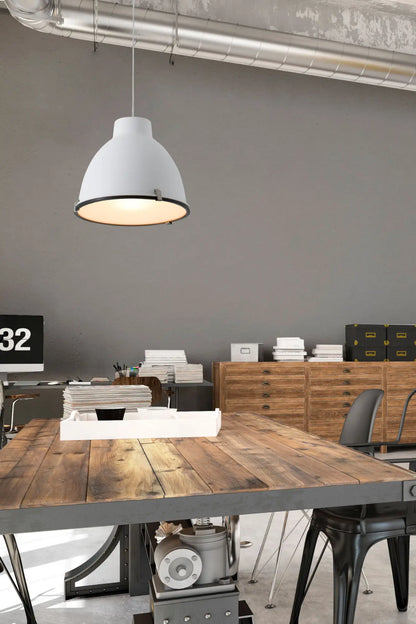 CHARLOTTE est une lampe suspension au style industriel affirmé, idéale pour l’éclairage domestique. Sa forme en cloche, associée à une finition blanc mat et à un diffuseur en verre opalin, en fait un choix aussi fonctionnel qu’esthétique pour les cuisines, les salles à manger ou les espaces de vie modernes.