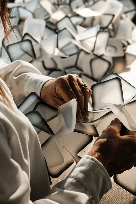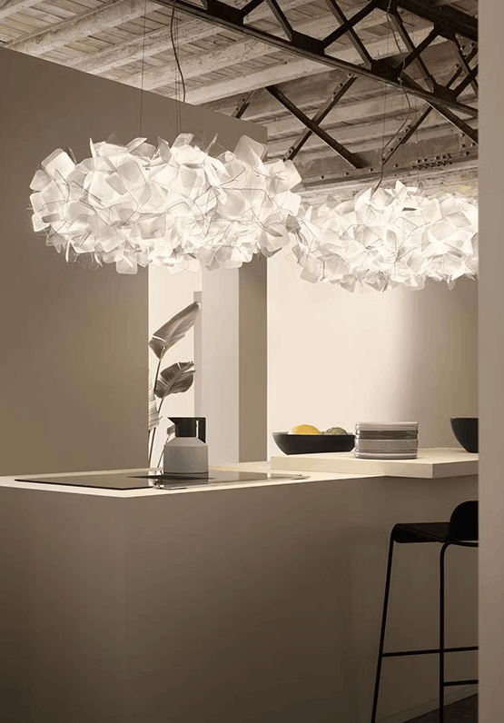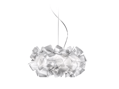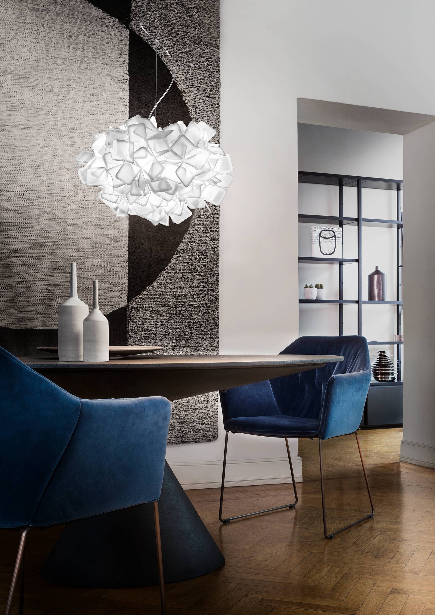 Des formes régulières, encastrées selon un équilibre parfait de transparence et de reflets, composent le design de Clizia. Cette lampe reprend les formes de la nature : c’est un nuage qui capture la lumière du soleil aux premières heures du jour et qui se charge de reflets chatoyants, c’est la cime d’un arbre à travers laquelle filtre la lune en créant des jeux d’ombres. Les versions dans lesquelles elle est disponible conjuguent esthétique et fonctionnalité : toutes sont dotées d’un support magnétique qui ancre la lampe aux surfaces (plafonnier et suspension) ou à sa base métallique (de table ou de terre).