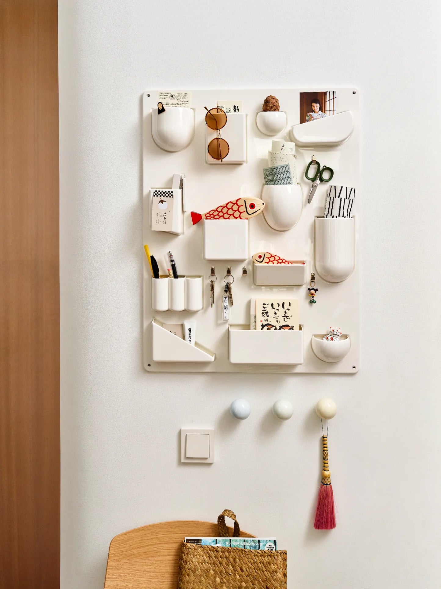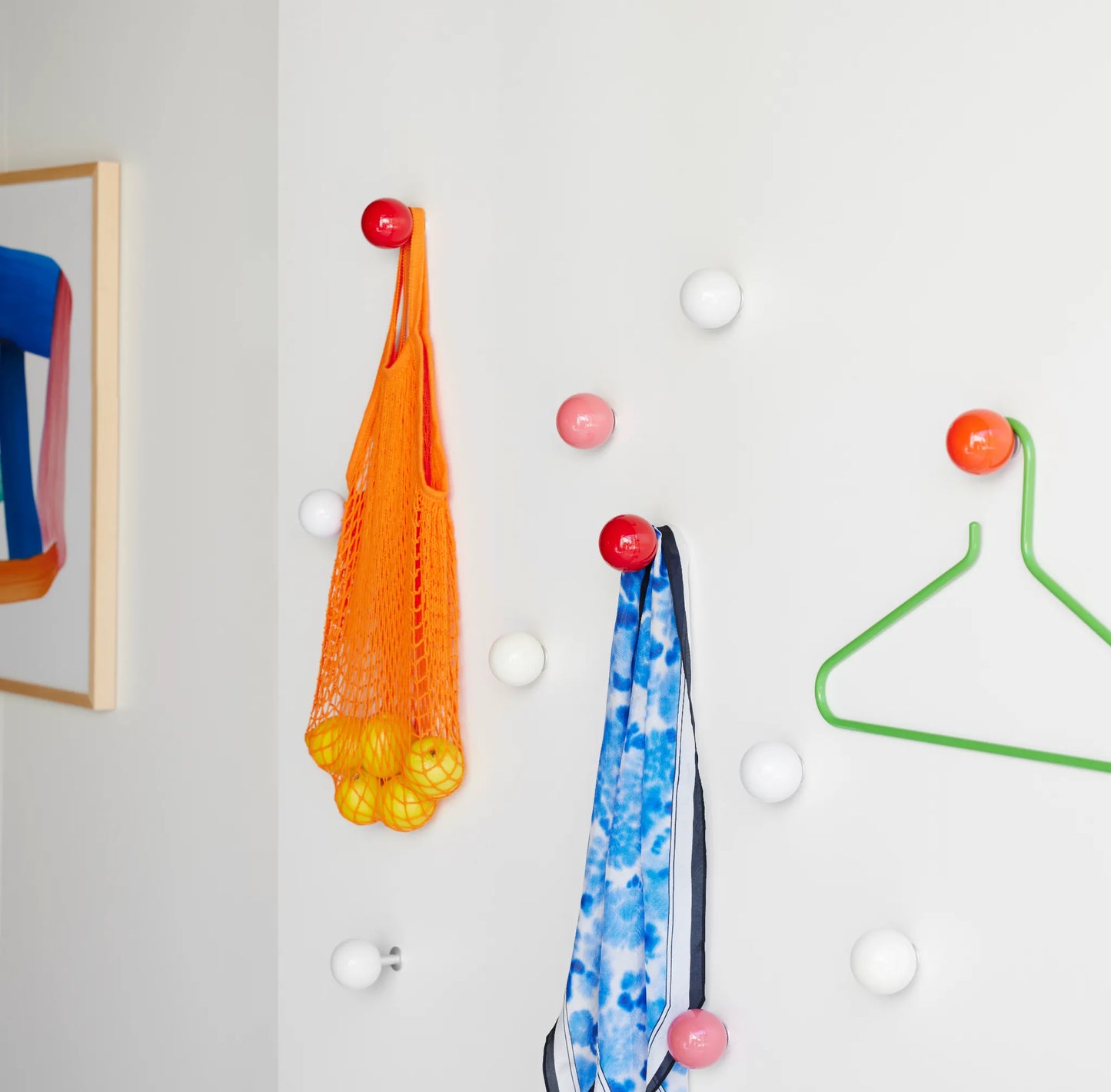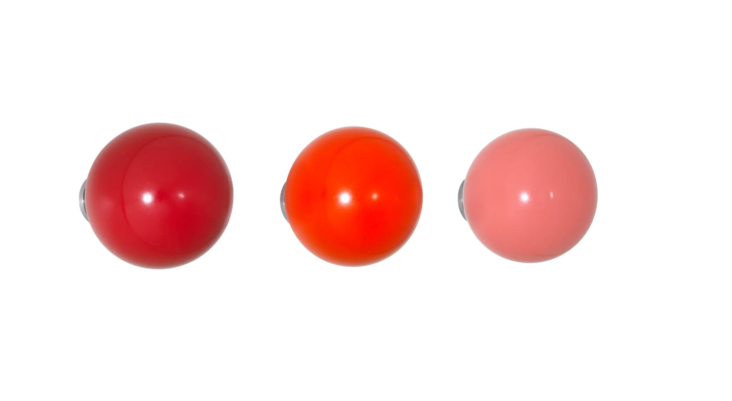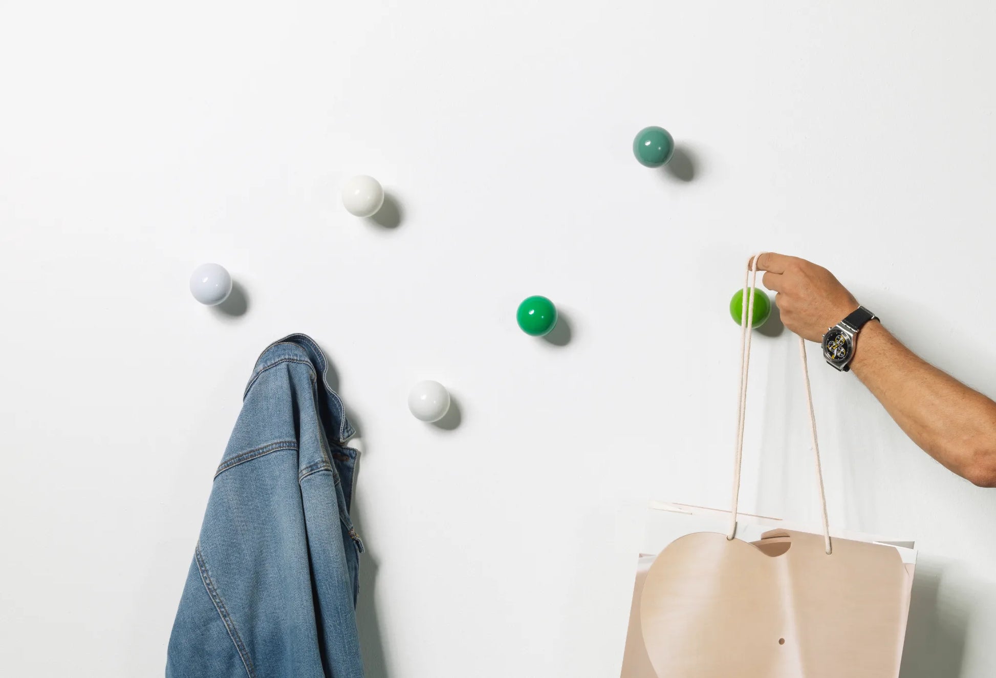 Les Coat Dots sont de petites boules en bois colorées qui se fixent au mur, créant des accents joyeux dans les cuisines et les salles de bains, ainsi que dans les espaces d'entrée et les vestiaires. Elles peuvent être regroupées dans des arrangements libres ou en rangées linéaires de trois boules ou plus, et permettent ainsi de créer d'attrayantes sculptures murales. Les Coat Dots peuvent également servir de patères si besoin est. Chaque boule est montée sur une tige en aluminium extensible pouvant être tirée légèrement hors du mur et former un crochet pratique pour manteaux, vestes ou cintres. Grâce à leurs couleurs vives et brillantes, les Coat Dots sont des accroche-regards séduisants.