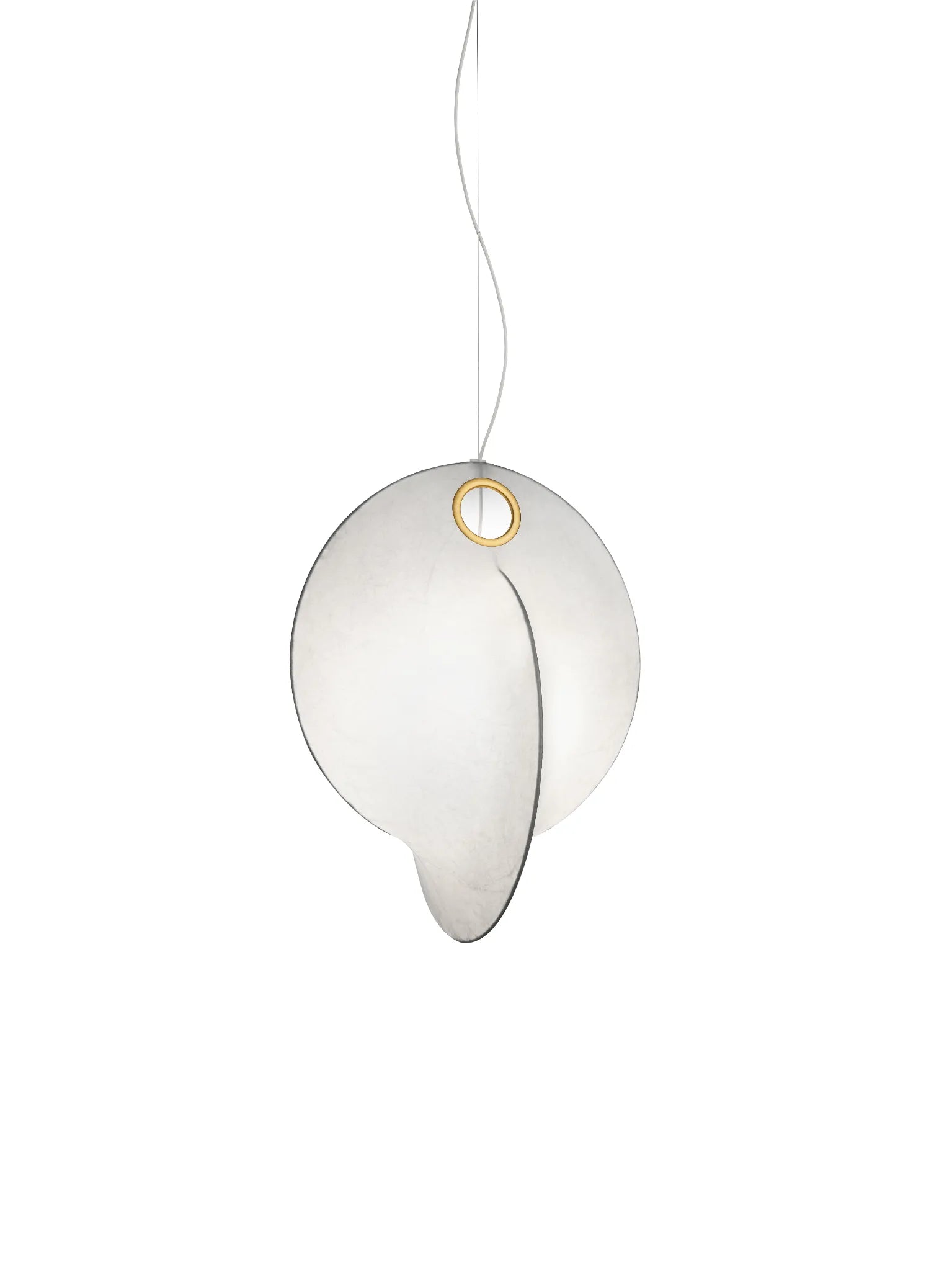 Michael Anastassiades a choisi la résine "cocoon" pour cette suspension. Ce matériau quasi ''organique'' évoque tout à la fois la légèreté d'une étoffe qu'on aurait figée, la texture chaleureuse du papier, la chrysalide d'un papillon en devenir...