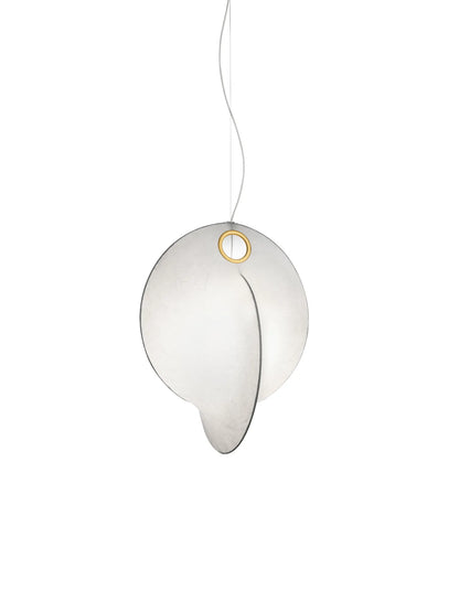 La résine ''cocoon'' appartient à l’identité de Flos depuis le début de son histoire en 1960 et a donné naissance à plusieurs pièces emblématiques de la marque comme la suspension Zeppelin. La résine "cocoon" est pulvérisée sur une fine structure en acier, formée de deux cercles qui s’entrelacent. Il en résulte une forme mystérieuse, presque vivante, comme si les cercles tentaient de grandir à l’intérieur de la membrane. Toute en volume, la forme de Overlap change selon le point de vue de l’observateur. Eclairée, elle fait naître dans l’espace une atmosphère chimérique et délicate, dotée d’une réelle force émotionnelle.