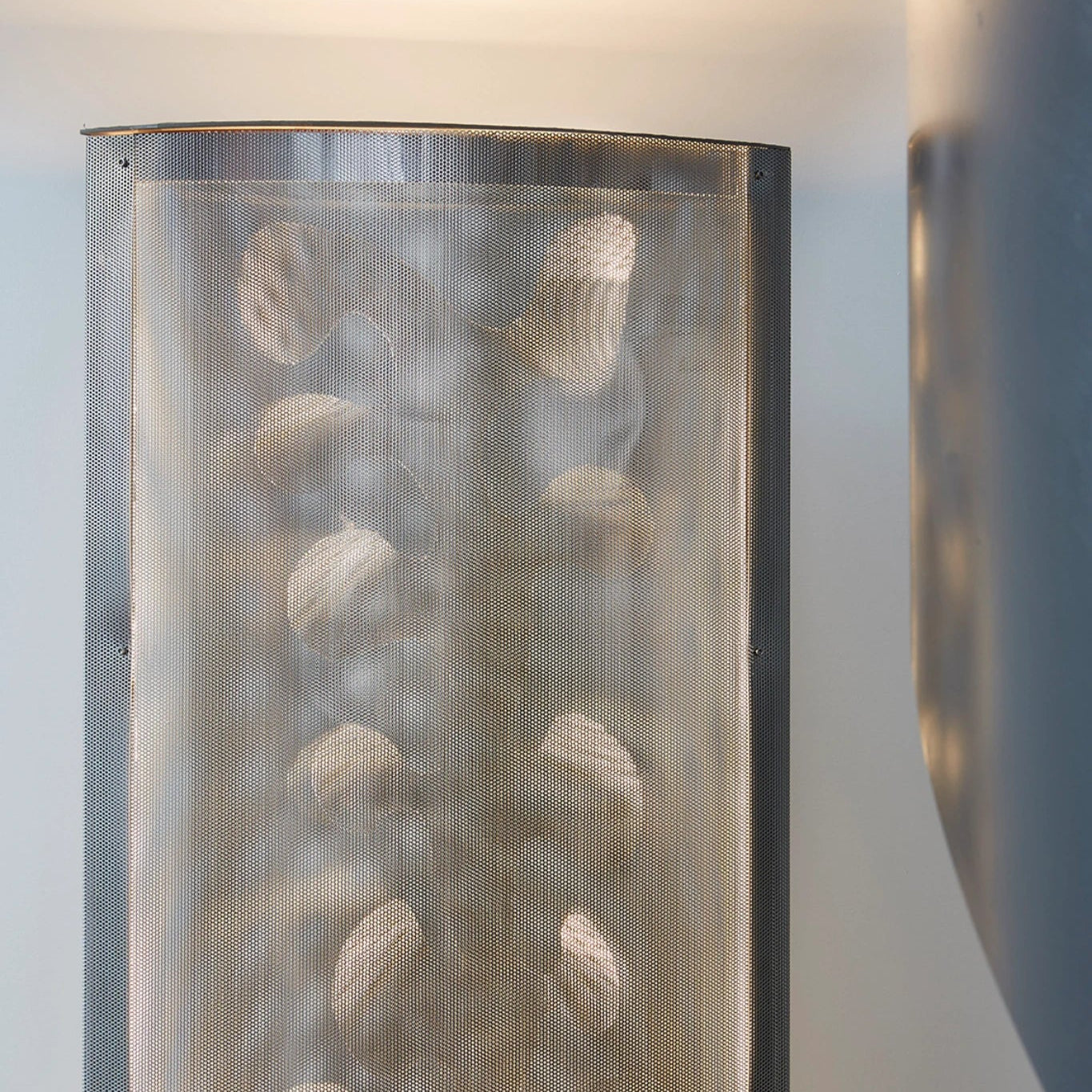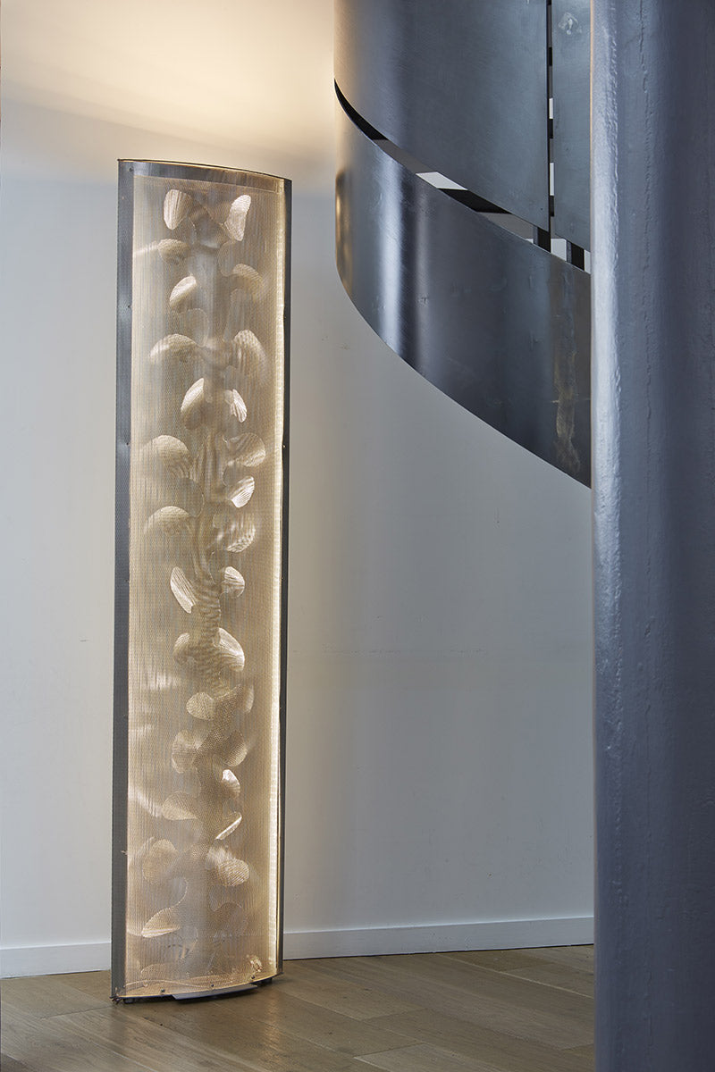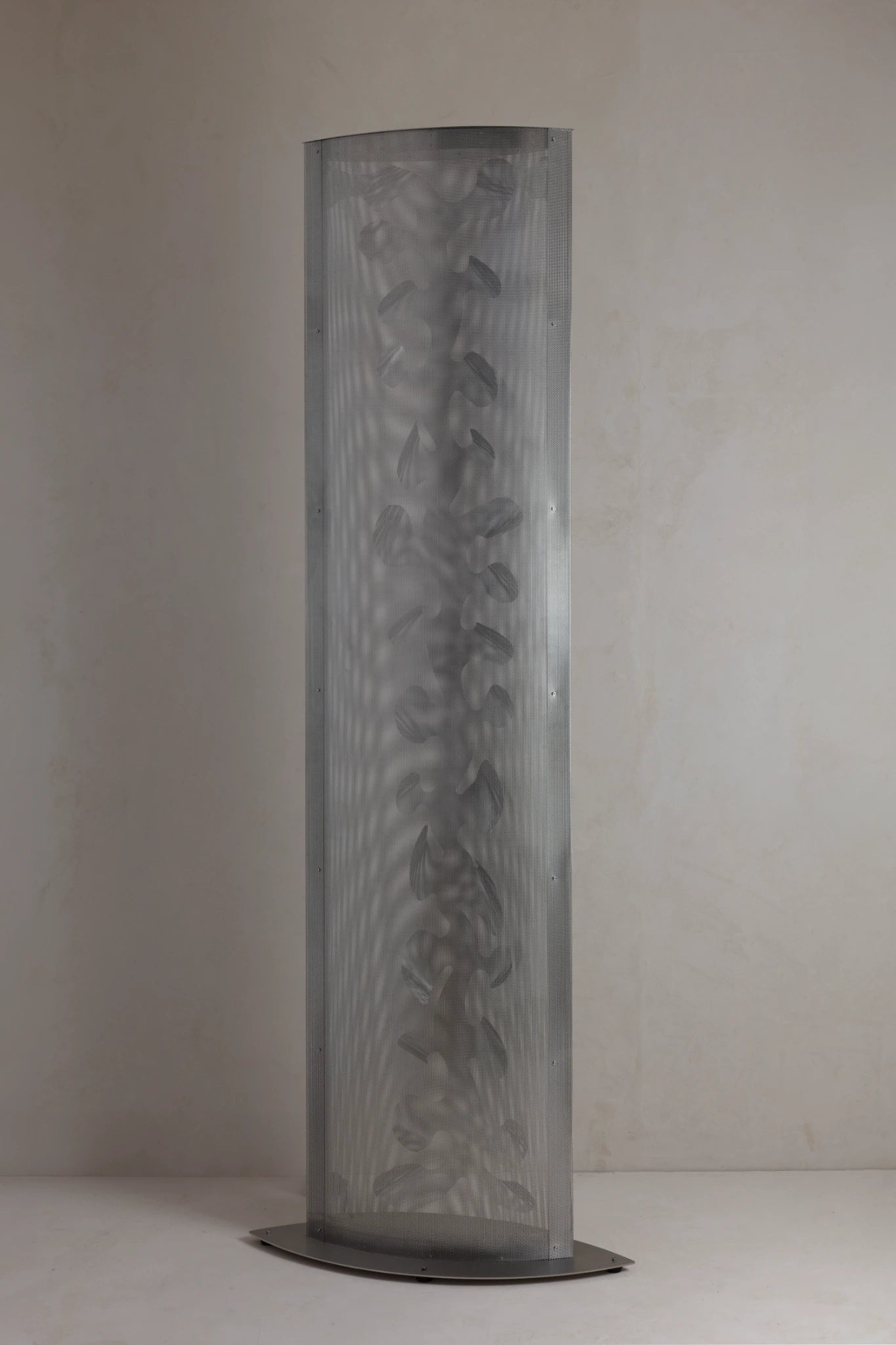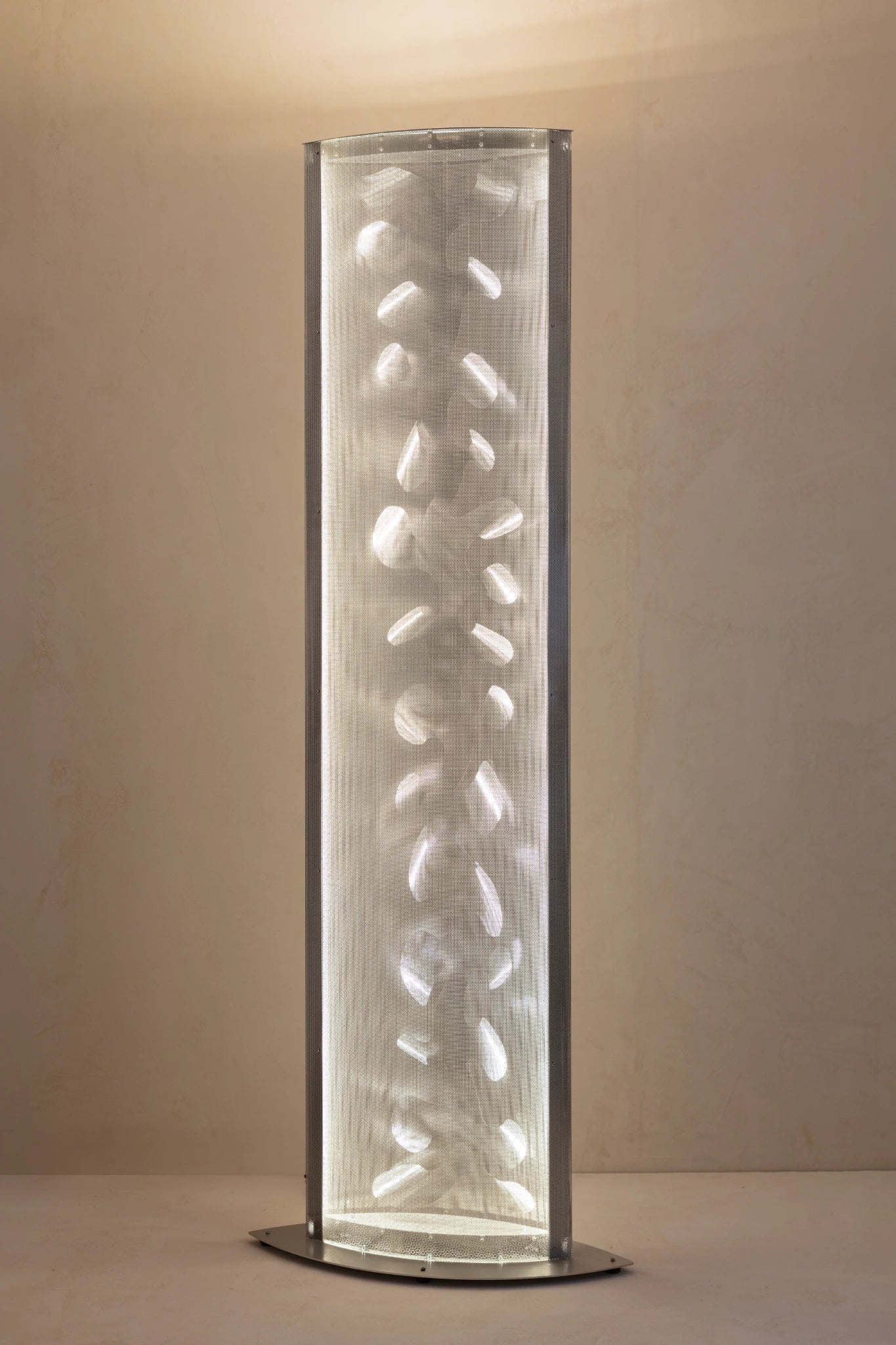 Véritable sculpture lumineuse en inox perforé poli miroir, la Colonne Ailes est réalisée de façon artisanale dans l'atelier parisien du designer.