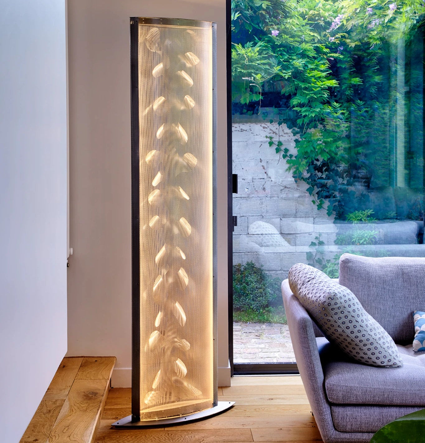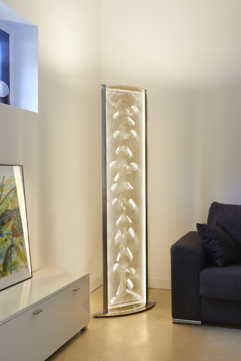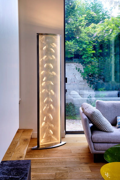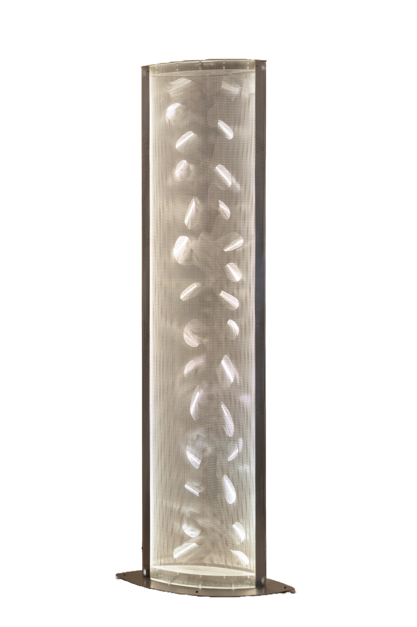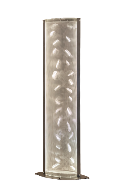 Véritable sculpture lumineuse en inox perforé poli miroir, la Colonne Ailes est réalisée de façon artisanale dans l'atelier parisien du designer.