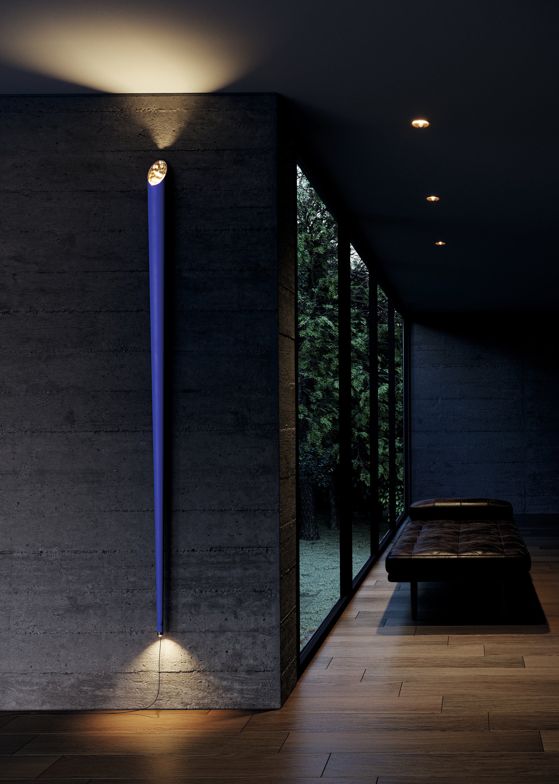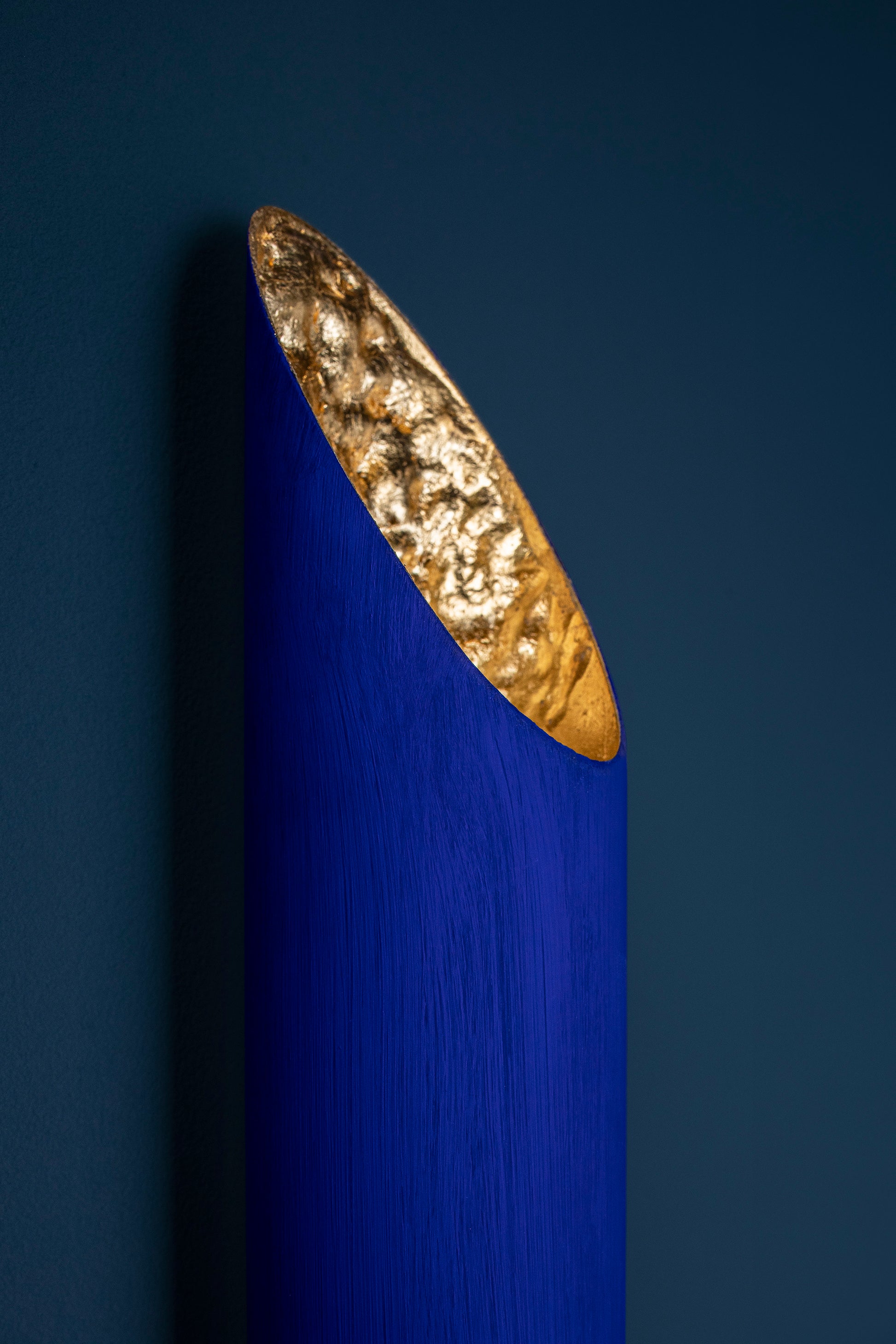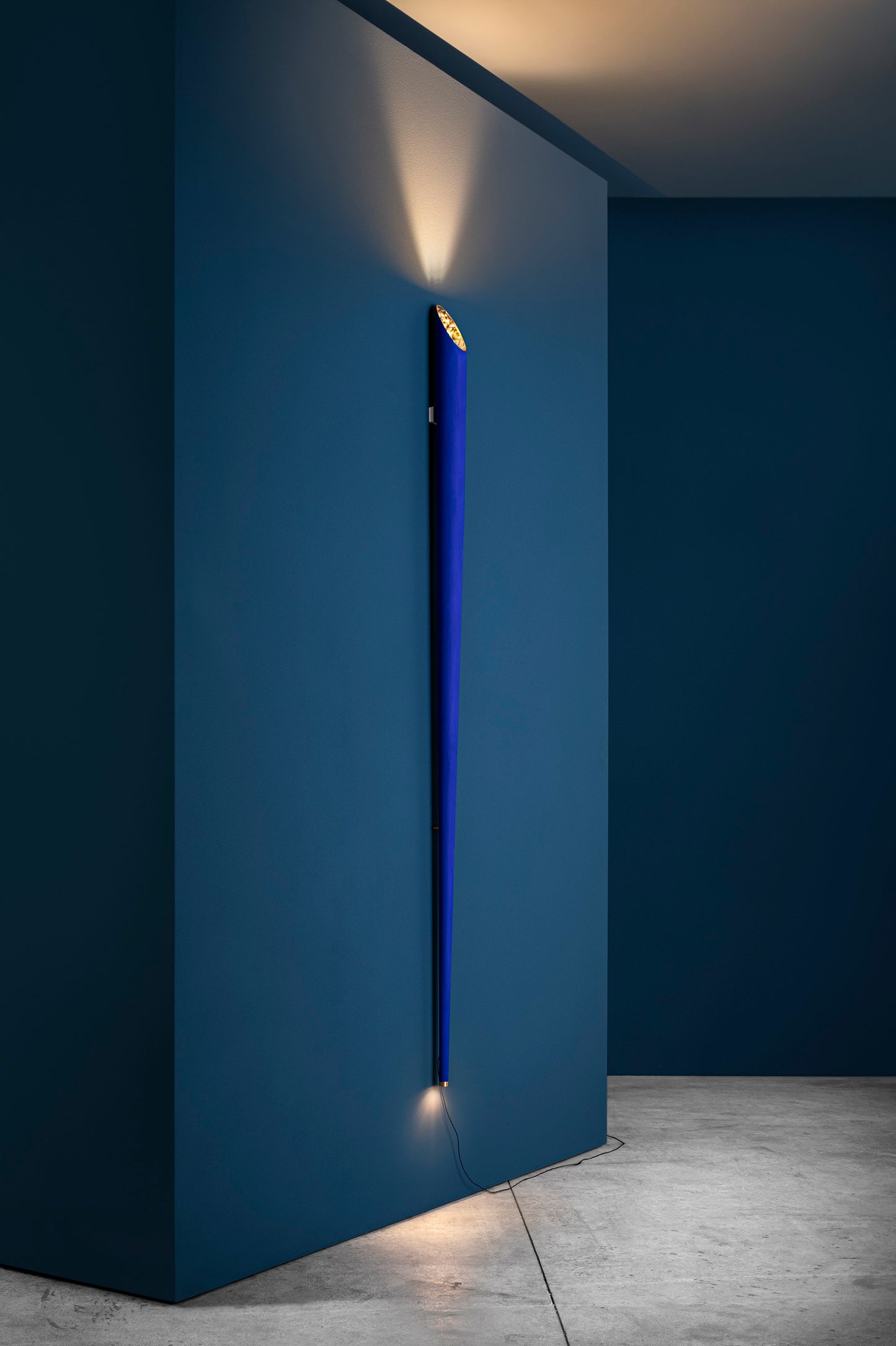 Cono W n'est pas seulement une lampe, mais une véritable sculpture lumineuse, grâce à sa structure tubulaire élégante et unique. La présence de deux sources lumineuses, l'une vers le haut et l'autre vers le bas, permet à cette applique d'être fonctionnelle et confortable dans différentes situations. Son allure a été donnée par l'utilisation de coups de pinceau irréguliers, tandis que la face intérieure du cône est embellie par des feuilles d'or. Adaptée à différents types d'environnements, Cono W reste dans tous les cas la protagoniste de la scène. Il faut qu'il y ait une distance d'au moins 30 cm par rapport au sol.