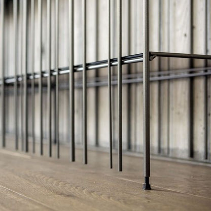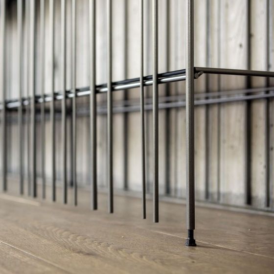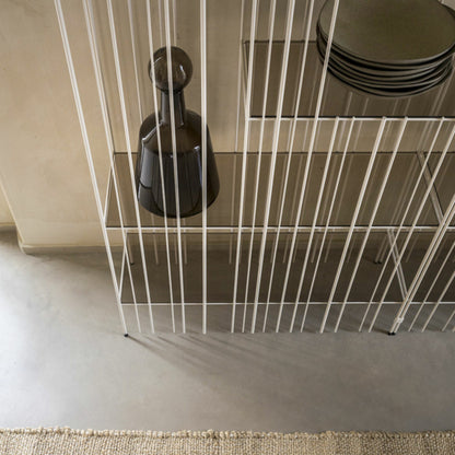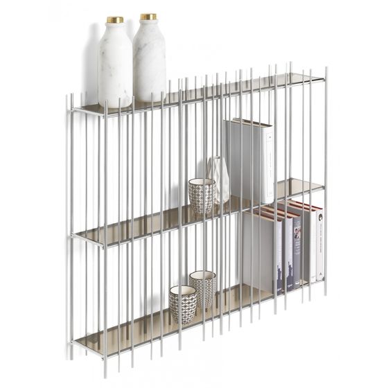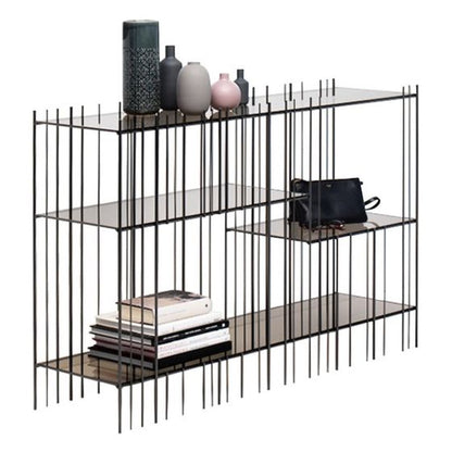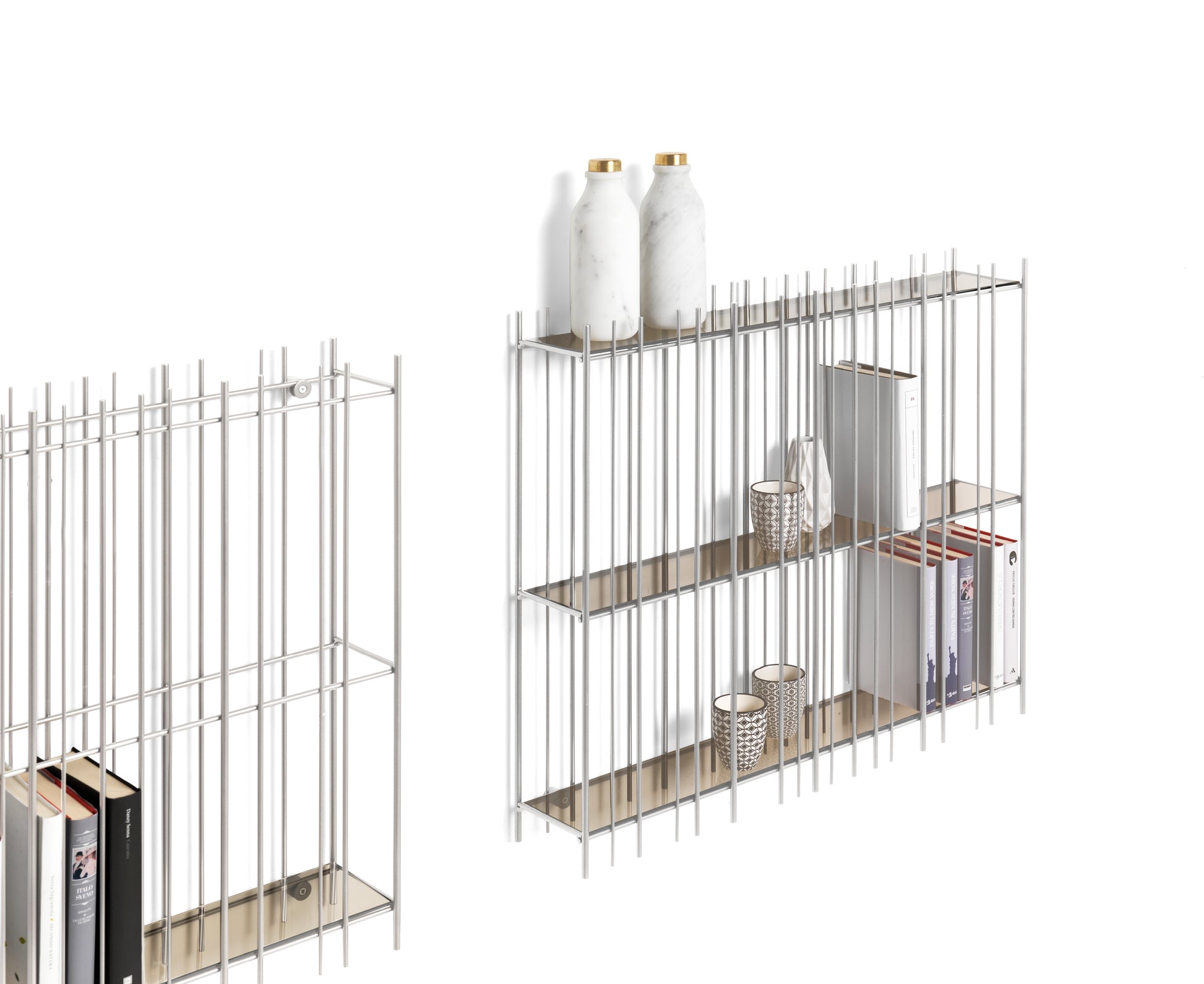 La structure est simple, le rythme est marqué par les tiges de fer fixées à différents intervalles sur une structure ouvertement rigoureuse à l'intérieur de laquelle les livres et objets insérés complètent la forme en écrivant de temps en temps de nouvelles compositions. Metrica est une console en métal disponible dans les finitions titane et bruni avec des étagères en cristal transparent disponibles en bronze ou vert. Etagères fournies en Bronze, en vert sur demande.
