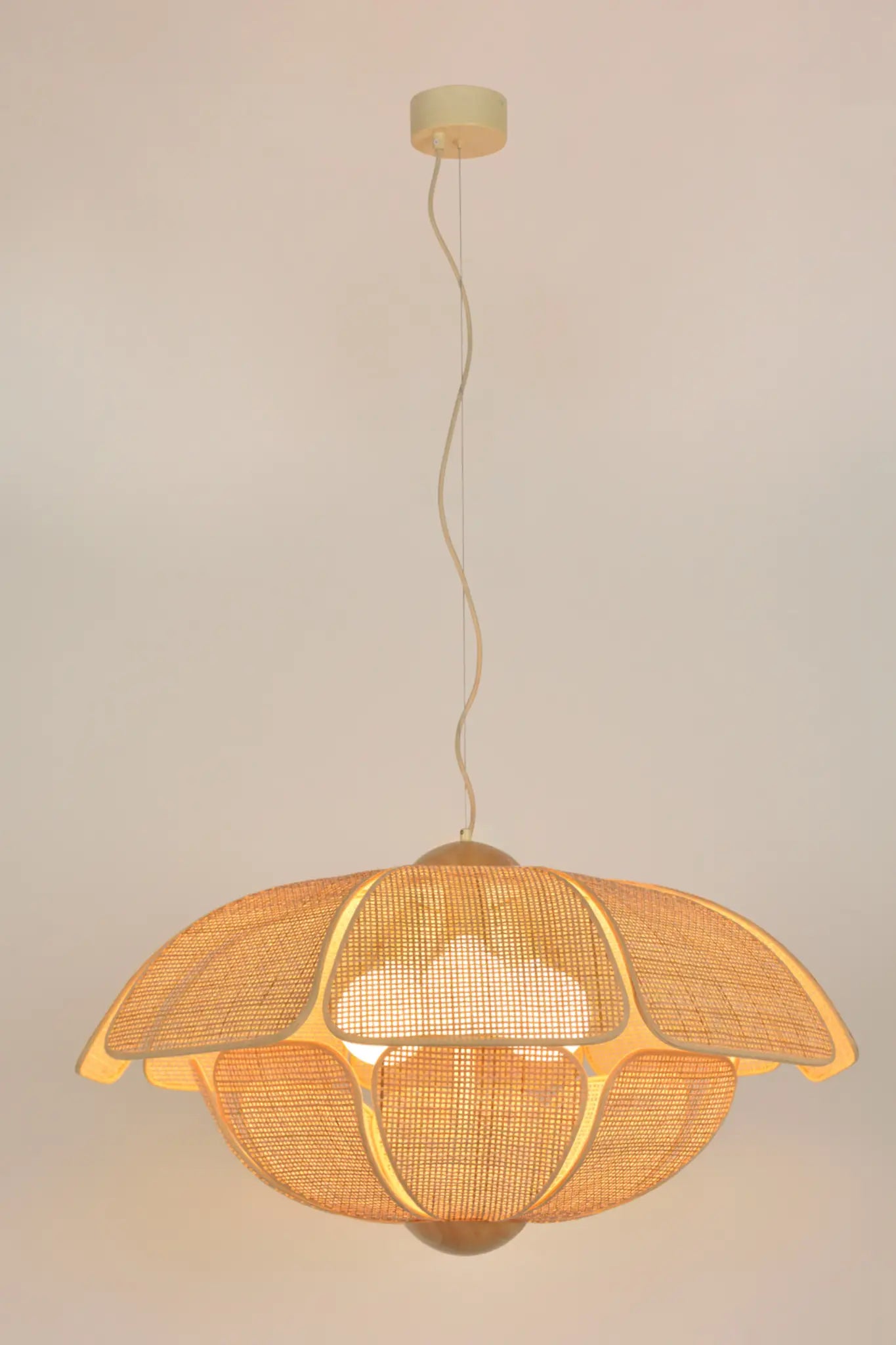 Cette suspension 3 lumières, inspirée de l'esprit coquillage, apporte une touche de charme et d’élégance à votre intérieur. Sa structure en métal peint soutient 16 écrans en cannage bordés en tissu, créant une lumière douce et diffuse qui transforme l’atmosphère de la pièce. La finition des caches douilles, en bois certifié FSC®, témoigne de l’engagement de cette suspension pour des matériaux durables et respectueux de l’environnement.