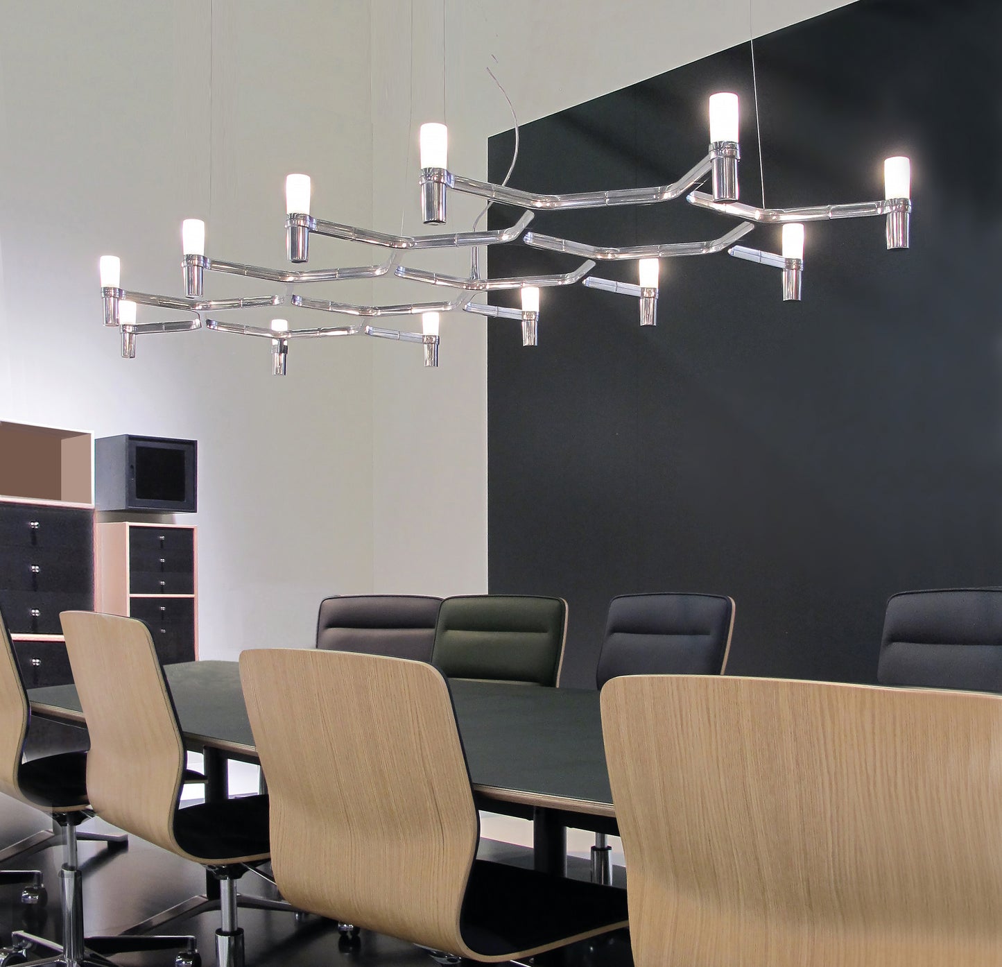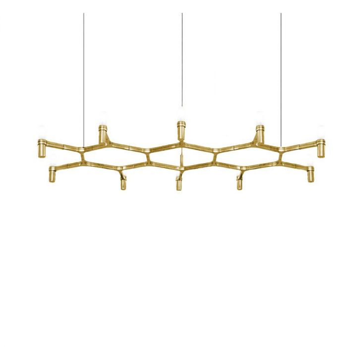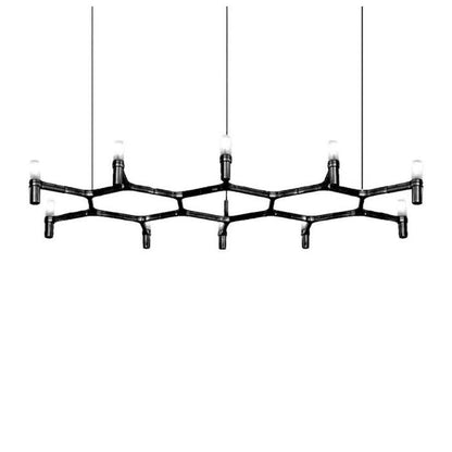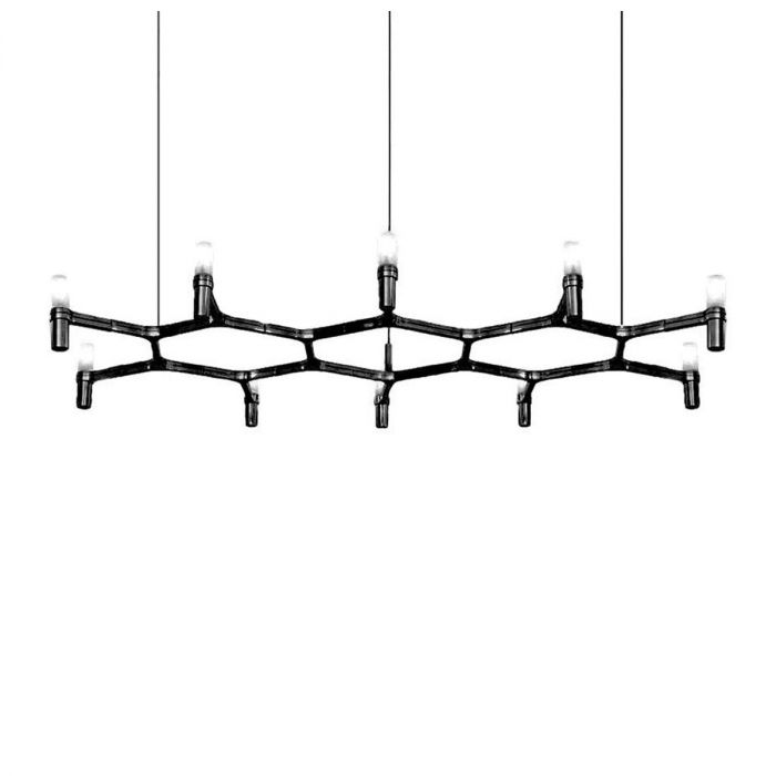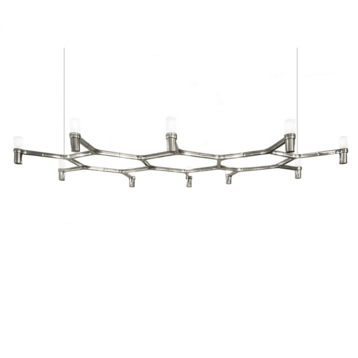 Famille composée de lustres suspendus dont la forme s'inspire du contour du cristal de neige. Lampes modulaires réalisées avec une structure en aluminium moulé sous pression et des diffuseurs en verre sablé.