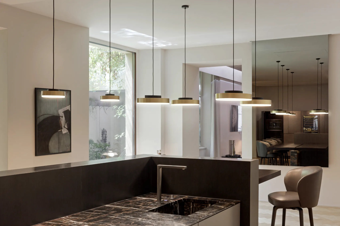 Deux disques métalliques, qui peuvent être blancs ou noirs, enferment la source éclairante dans un jeu d'emboîtement. Le diffuseur en opale blanche au milieu est encadré par une bande de laiton semi-polie qui donne une touche de luxe au design. La forme particulière de la structure, qui dans la version murale a un bras rotatif à 120°, permet à la lumière de se répandre uniformément sur toute la surface - ce qui rend le produit idéal pour n'importe quel emplacement et utilisation, dans des contextes résidentiels et d'accueil haut de gamme.