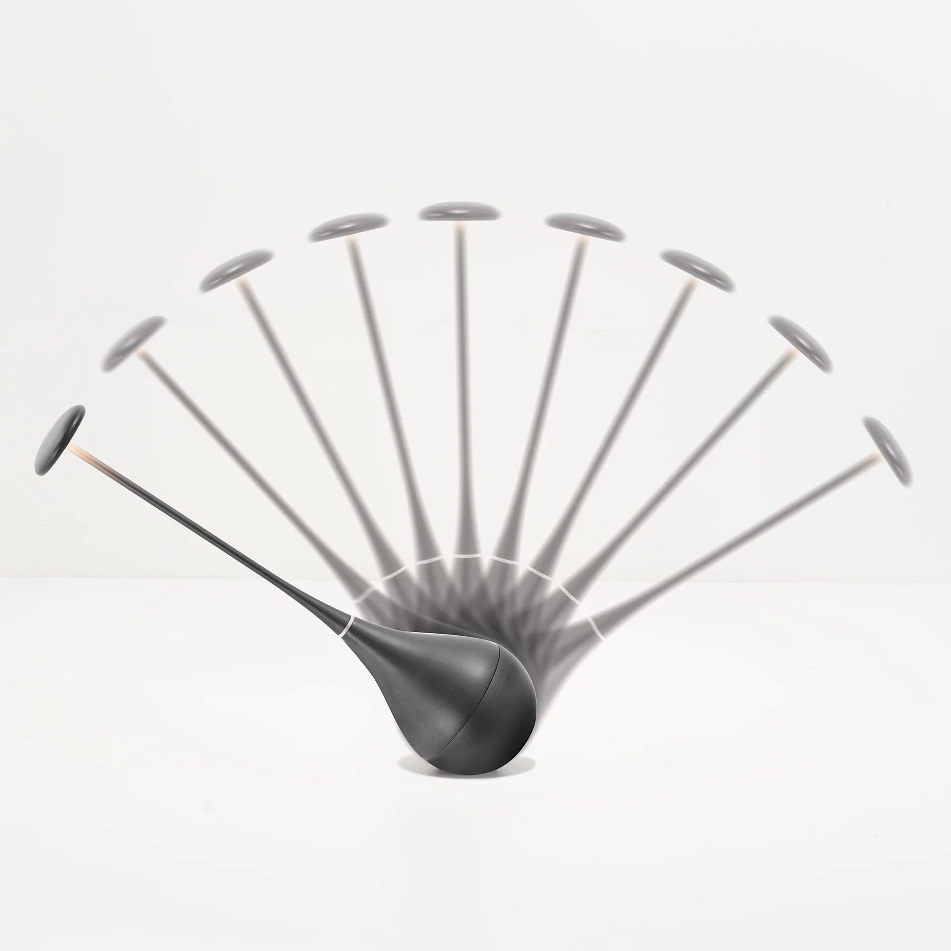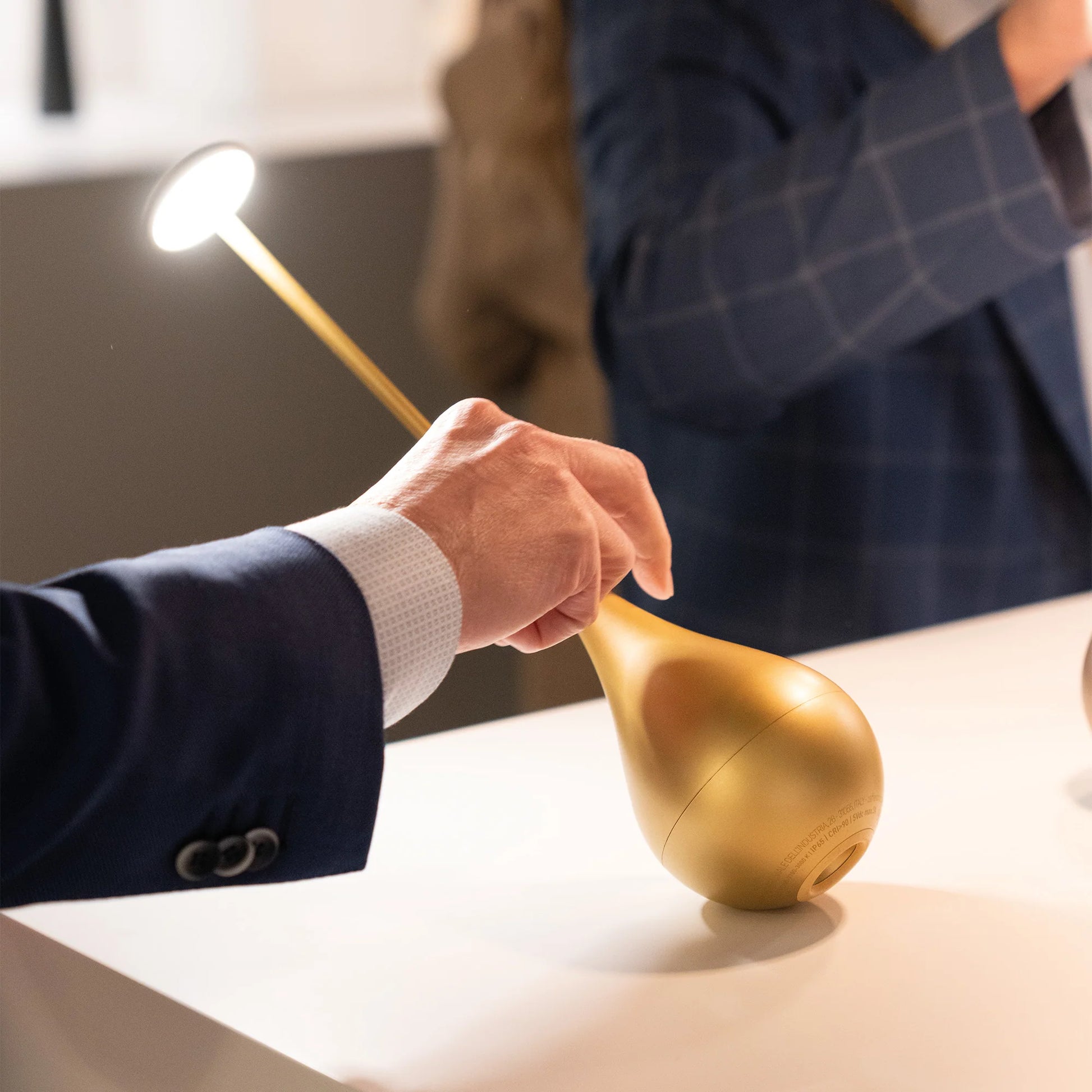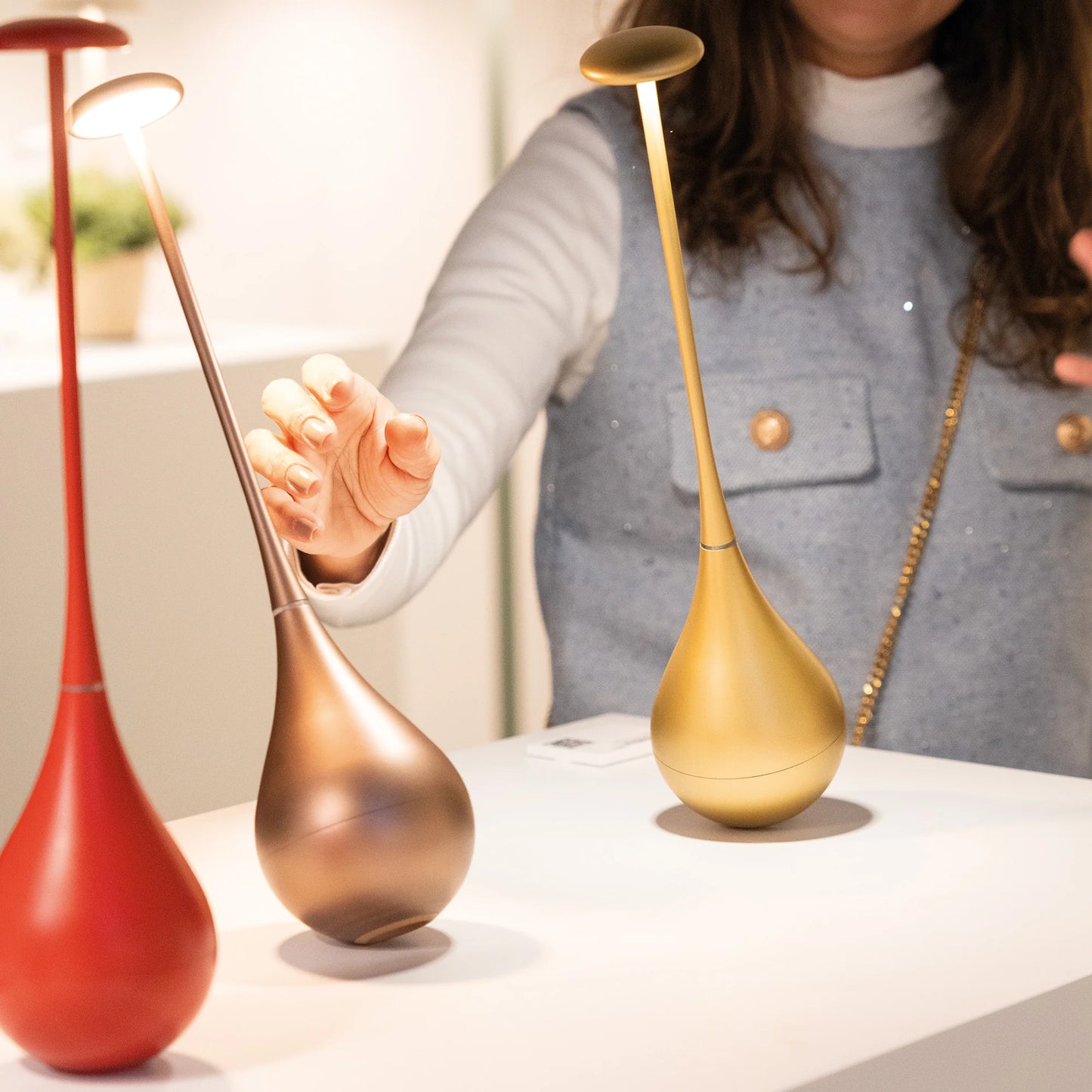 Dondolina est une lampe de table sans fil au design pop et original. Rechargeable et utilisable dedans comme dehors (IP65), elle se distingue par sa forme élancée et sa base arrondie qui lui permet de s'incliner avec un effet ludique.