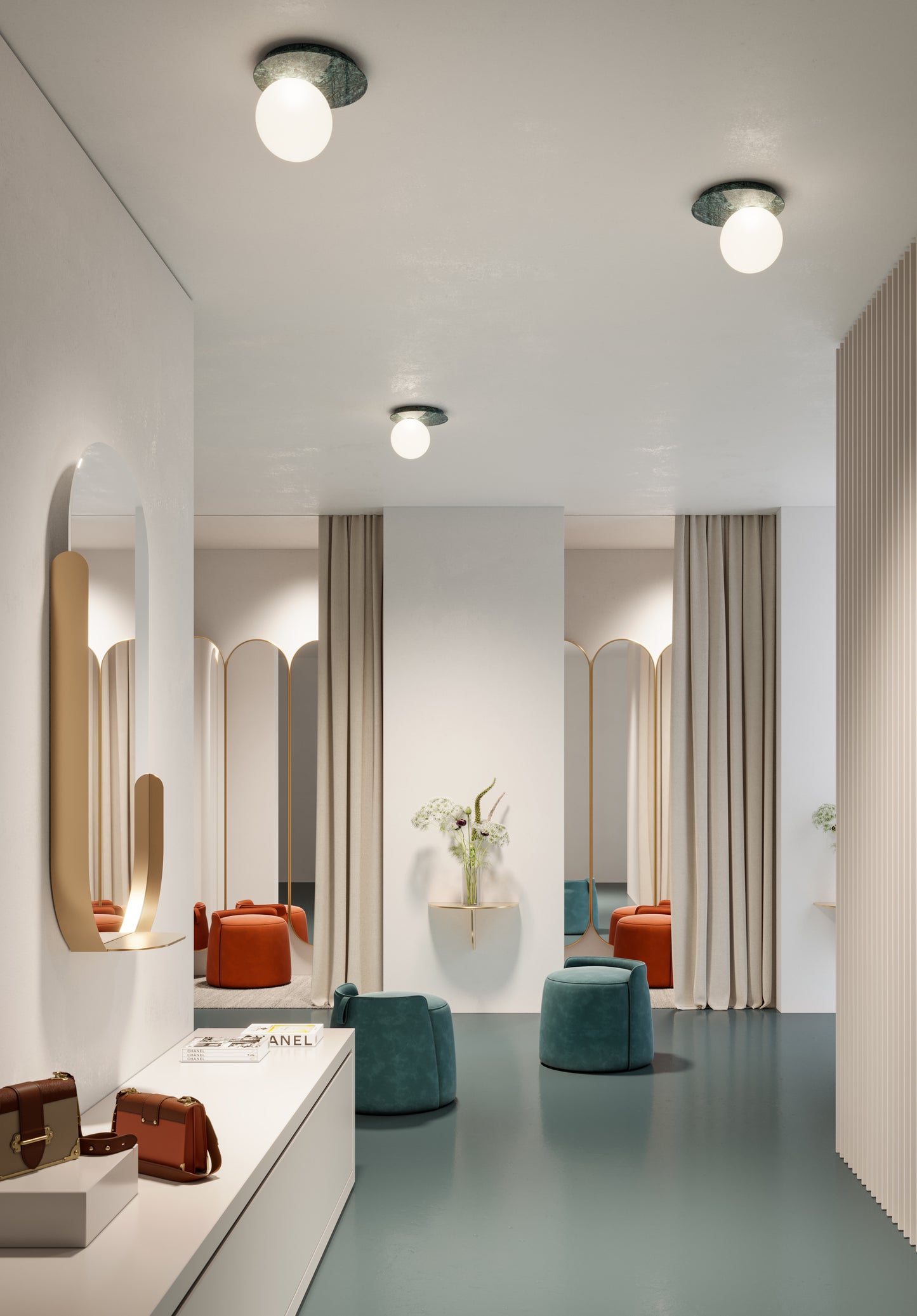 La base des versions table, murale et plafonnier est en marbre vert Guatemala ou blanc Calacatta, le diffuseur est une sphère d'opale blanche fascinante qui, grâce à son essence pure, diffuse la lumière uniformément. Le charme simple et les formes sinueuses d'Emma s'adaptent à différents types d'environnements, qu'ils soient résidentiels, commerciaux ou hôteliers.