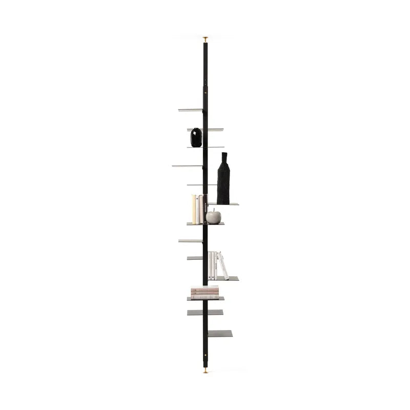 C'est une bibliothèque élégante, forcée entre le sol et le plafond avec un bâton vertical de section carrée où sont fixées asymétriquement sur les 4 côtés des étagères de deux tailles différentes (20x30 cm, 25x30 cm). C'est un élément qui peut être utilisé comme cloison, comme bibliothèque capable de personnaliser tous les recoins. Il est impératif de choisir un embout de fixation à la hauteur de votre pièce. Partie A pour des hauteurs de 236cm à 260cm, partie B 260cm à 281cm, partie C 281cm à 302cm. La structure est en en bois massif d'Iroko.