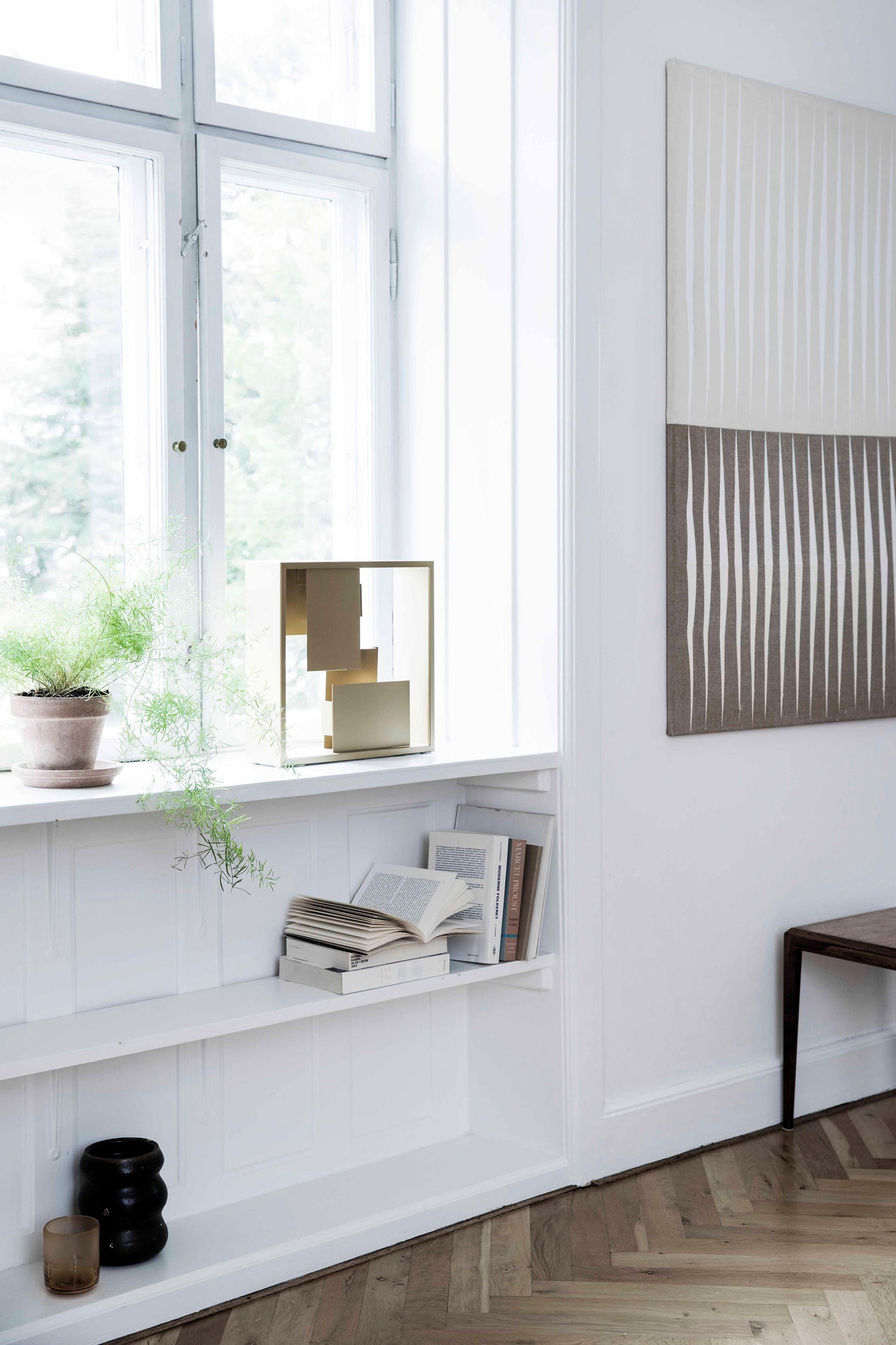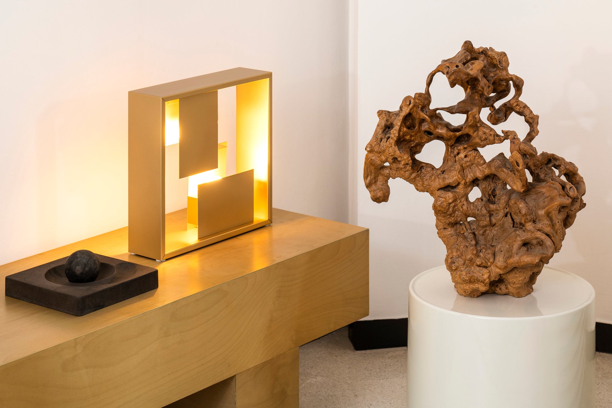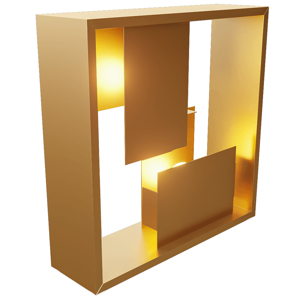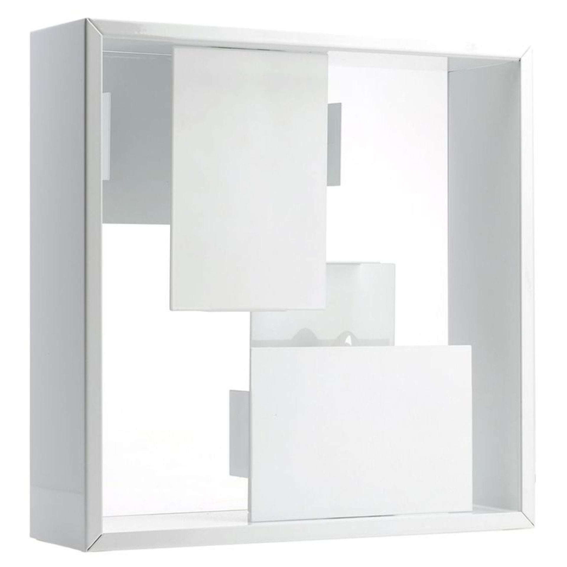 La mythique lampe Fato d'Artemide avec ses écrans métalliques géométriques, ses peintures de fond de lumière et d'ombre, de pleins et de vides, renfermés dans un cadre carré. Cette lampe de table ou applique se présente tel un objet lumineux multifonctions: lampe et vitrine évoquant une sculpture lumineuse dans les style typique des années 60. Structure en tôle émaillée pliée et soudée blanche. Emission lumineuse indirecte.