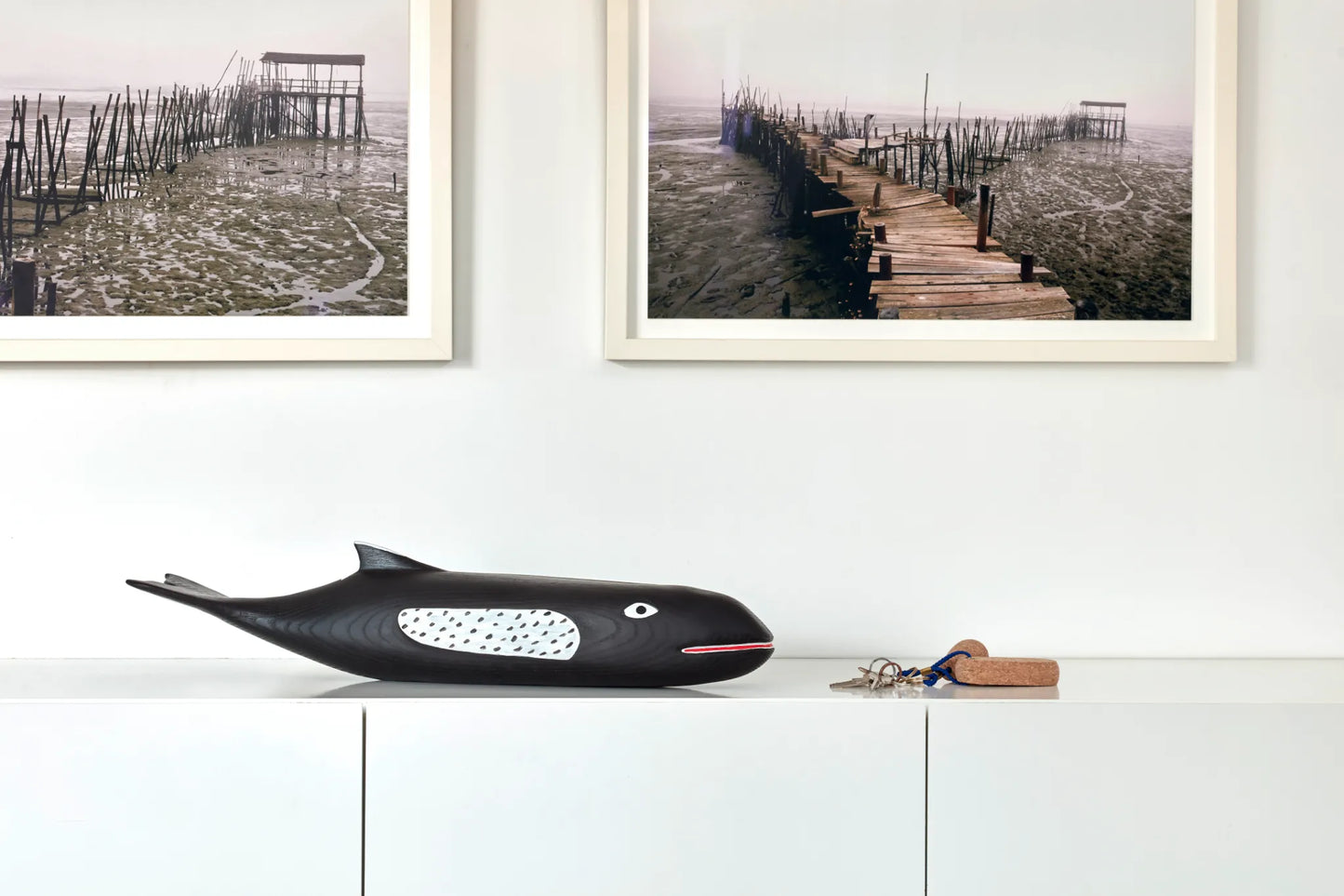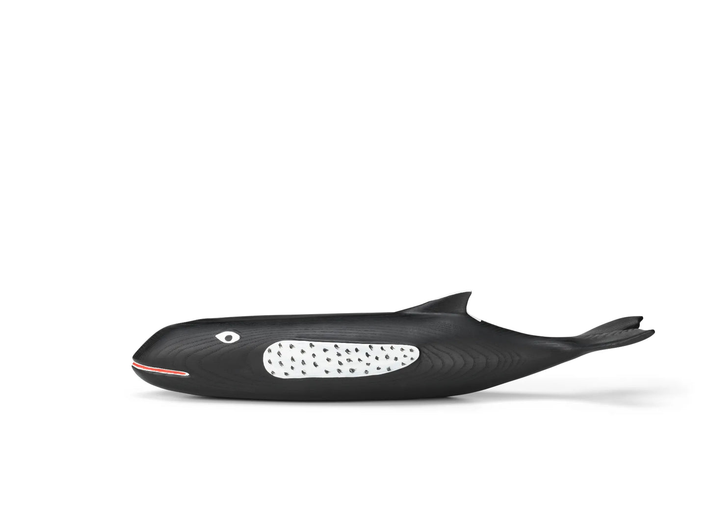 Une des caractéristiques dominantes de la collection Eames était une énorme baleine en bois de plus de deux mètres de long, une œuvre anonyme d'art populaire nord-américain. Charles et Ray Eames étaient particulièrement passionnés par cet objet peint : il occupait une place permanente dans l'Eames Office et apparaissait également dans des séances de photos, comme les premières photos du Lounge Chair. La reproduction à plus petite échelle du Eames House Whale par Vitra est réalisée en bois de frêne et peinte à la main.