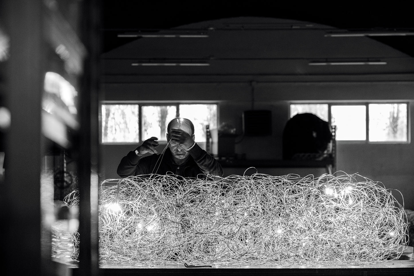 Fil de Fer est une lampe en fil d’aluminium modelé et tressé, éclairée à l’intérieur par de minuscules ampoules. Conçue et réalisée par Enzo Catellani, c’est la création à laquelle il est le plus attaché. Née il y a près de vingt ans pour une commande spéciale, elle n’a pas été utilisée pour ce projet-là, et est donc restée suspendue dans son laboratoire. Chaque fois que cette lampe était vue allumée, elle arrivait à enchanter son spectateur par quelque chose de spécial et de magique. Enzo Catellani décide alors de continuer à y travailler. Cette lampe est ensuite mise sur le marché, et devient l’icône la plus représentative de la production Catellani & Smith.