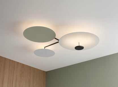 Flat est un grand plafonnier composé de disques horizontaux. Sous l’effet de la réflexion, les disques semblent rétroéclairés. Le plafonnier Flat se caractérise par son caractère graphique alliant matérialité et fonctionnalité.