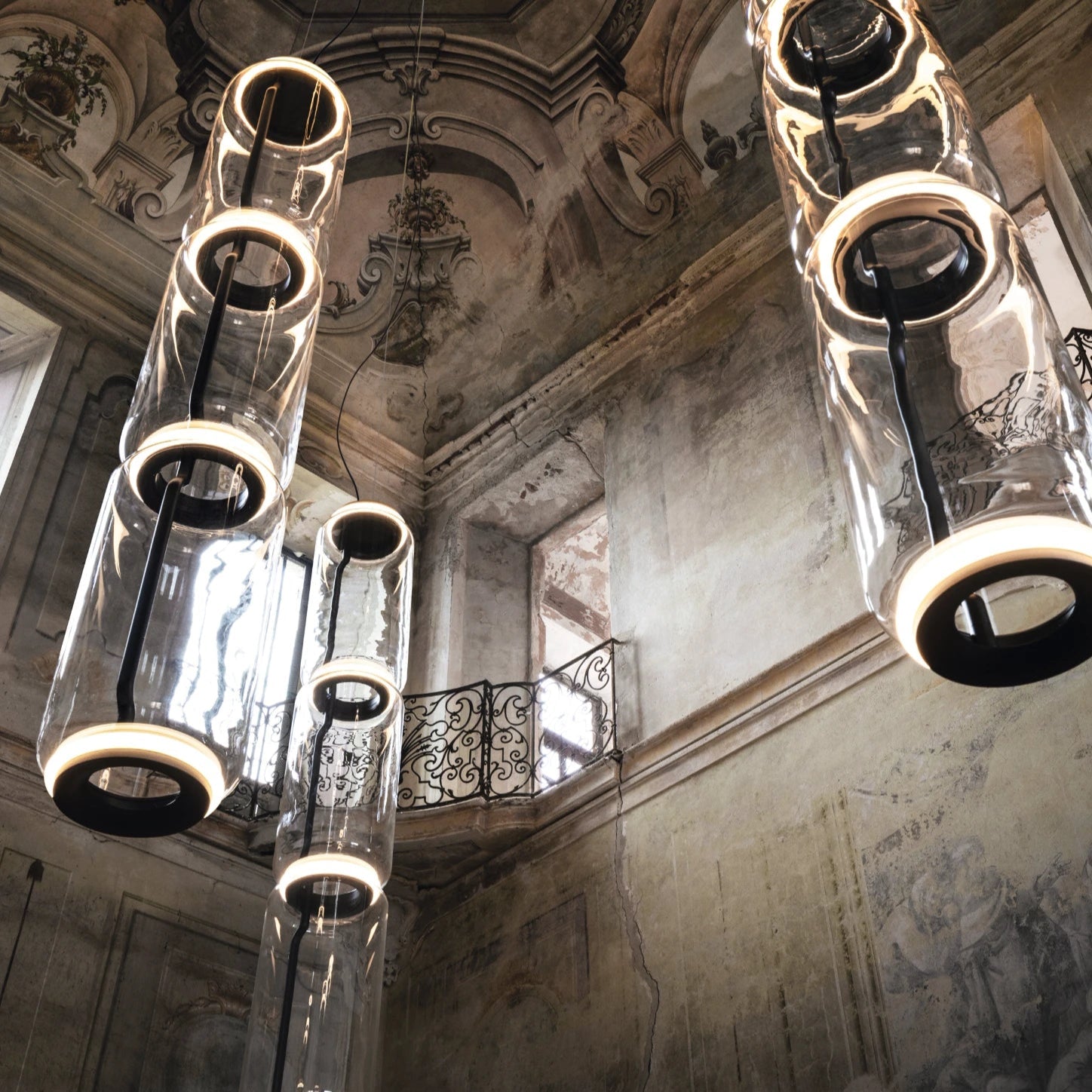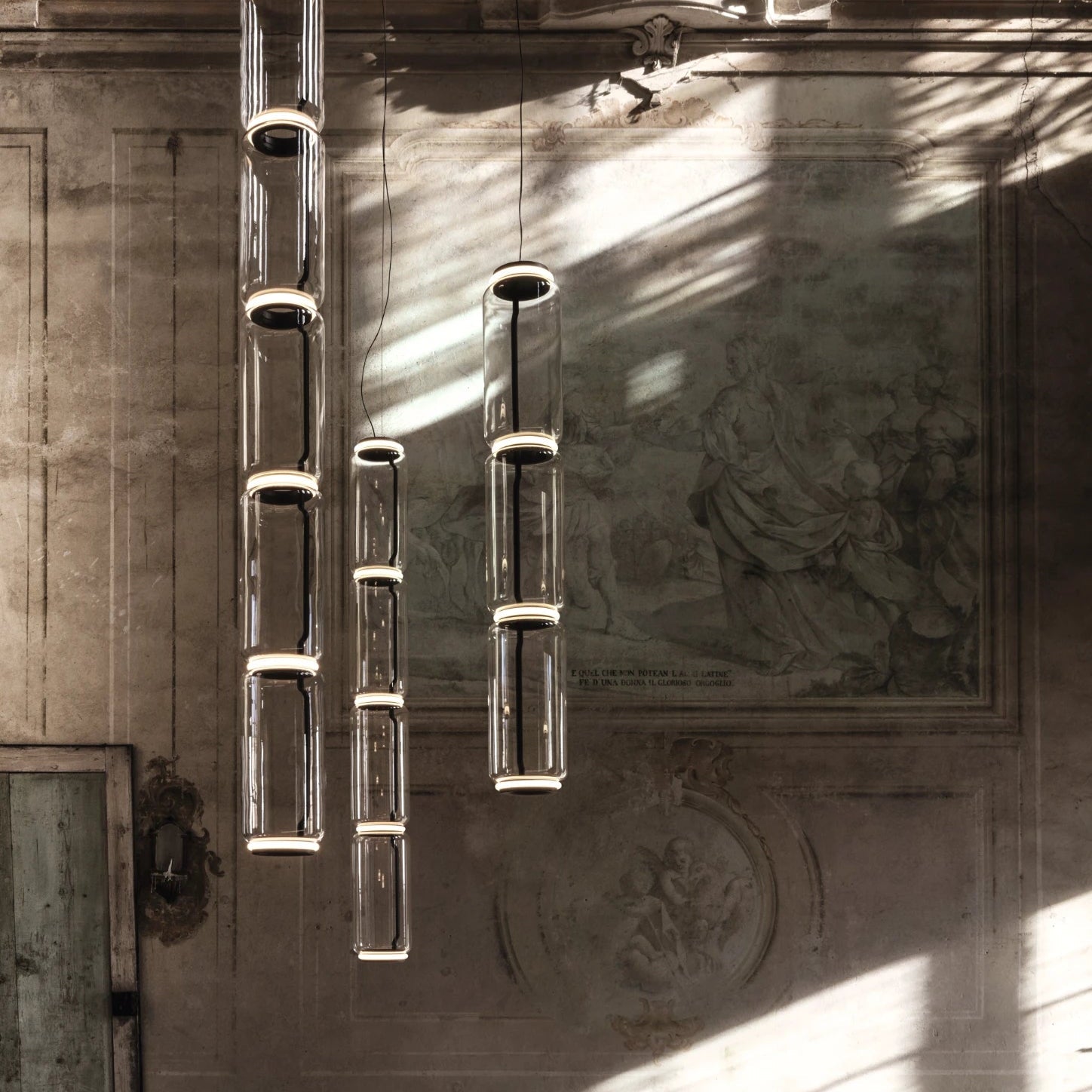 Suspension issue de la collection Noctambule éditée par Flos, ce modèle est composé de 4 cylindres successifs de 45cm de hauteur chacun. Cette gamme permet des compositions de plusieurs éléments en verre connectés entre eux pour atteindre une hauteur de 3,2 mètres (magnifique dans une cage d'escalier!).