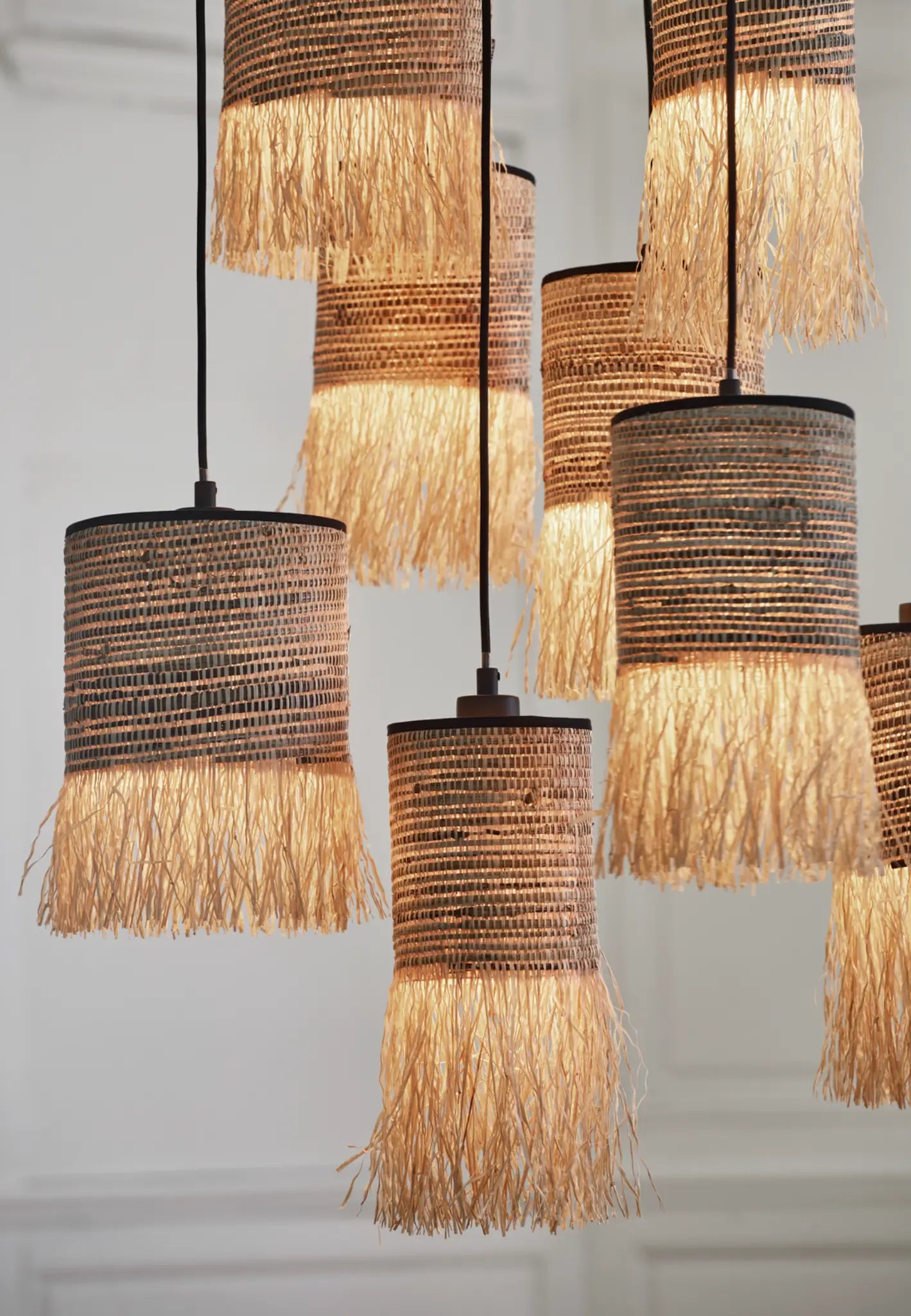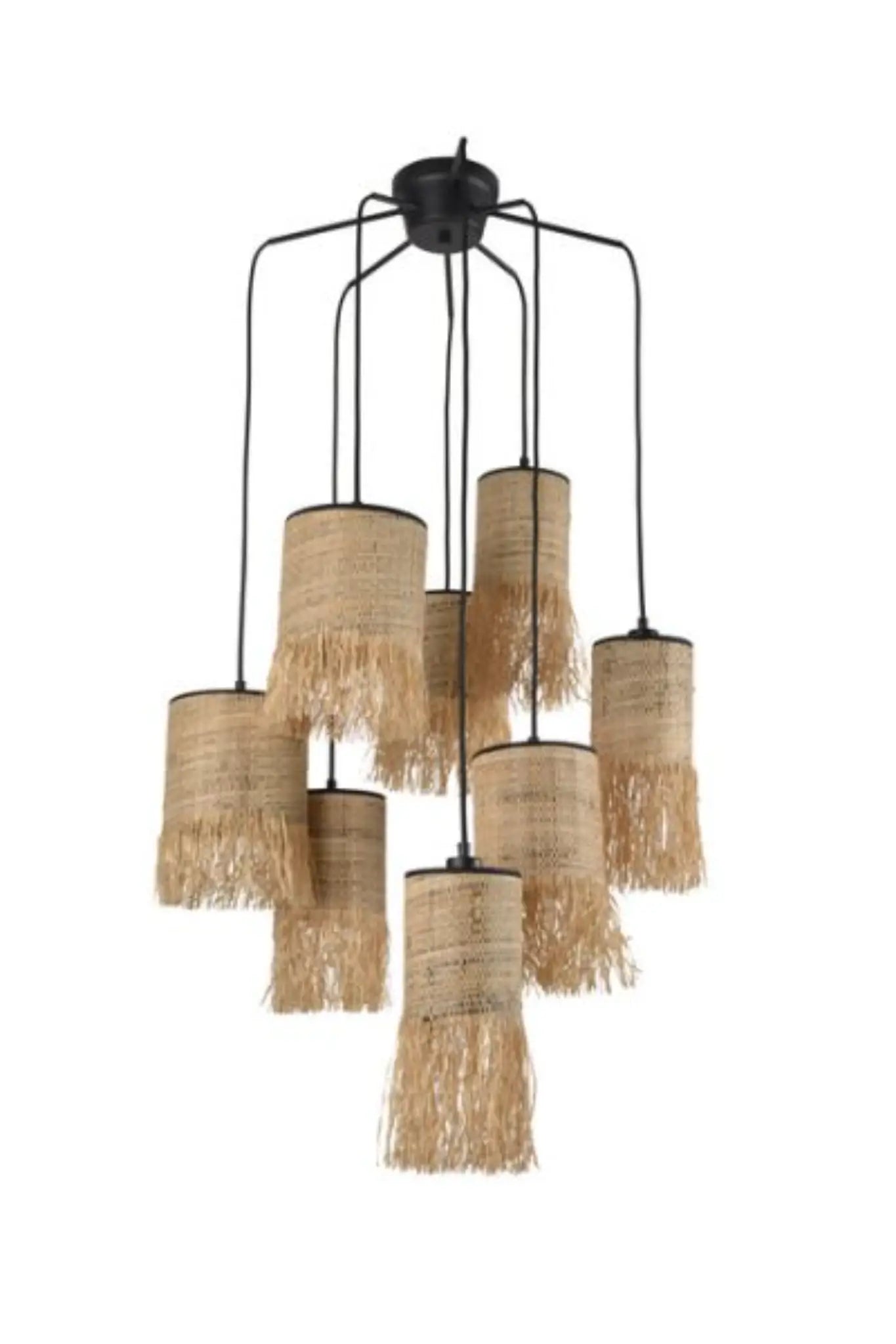 Suspension 8 lumières avec abat-jours en bana et raphia frangé, équipée de cordelières textiles et silicone. Design bohème chic, créant une ambiance chaleureuse et méditerranéenne.