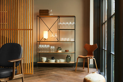 Avec une élégance intemporelle, les étagères Planner sont fabriquées en acier thermolaqué avec une finition mate. Les joints sont soudés à la main et légèrement arrondis pour adoucir l’expression générale. Des tiges diagonales sur les deux grands modèles offrent un support supplémentaire. Les étagères sont taillées dans du chêne massif naturel. Elles sont biseautées sur les bords pour s’adapter parfaitement au cadre.