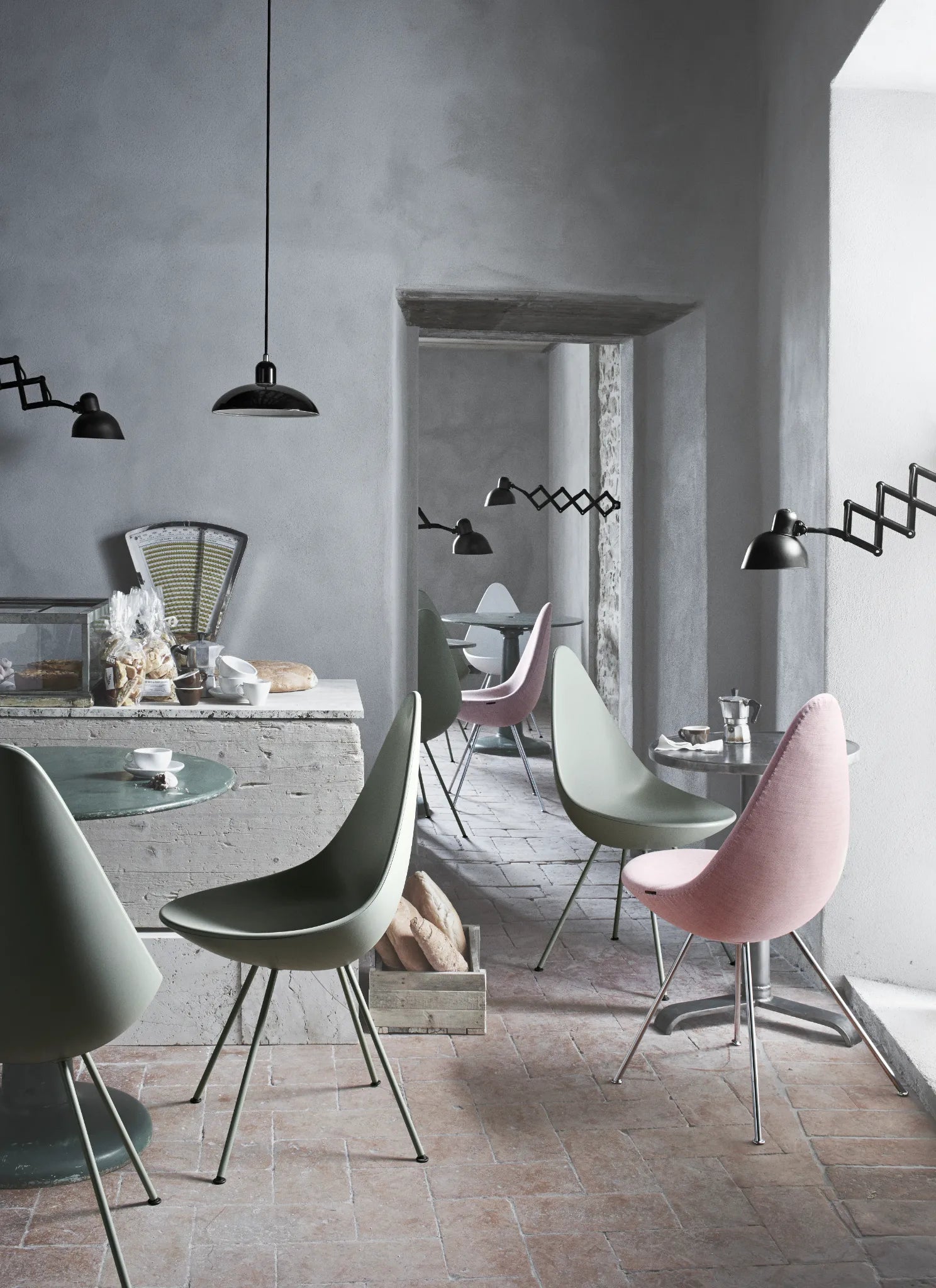 La collection Kaiser Idell se décline plusieurs modèles de lampadaires, lampes de bureau, suspensions et appliques. Sa spécificité réside dans son diffuseur à la forme si caractéristique et sa rotule mondialement brevetée. L'abat-jour est réalisé à partir d'un acier de grande qualité et peint à la main dans des couleurs brillantes. Les éléments de la lampe chromés sont constitués de laiton poli à la main. Le design de cette collection est aujourd'hui reconnu comme un classique légendaire. L'abat-jour à joint pivotant breveté de Dell est associé à un bras en ciseaux extensible sur le 6718-W pour apporter une lumière flexible et focalisée dans la pièce.