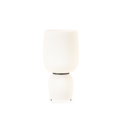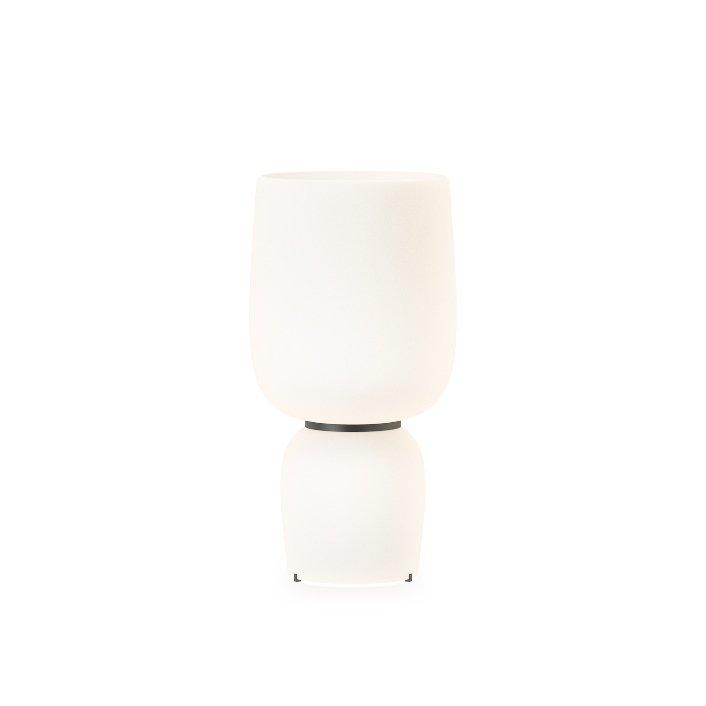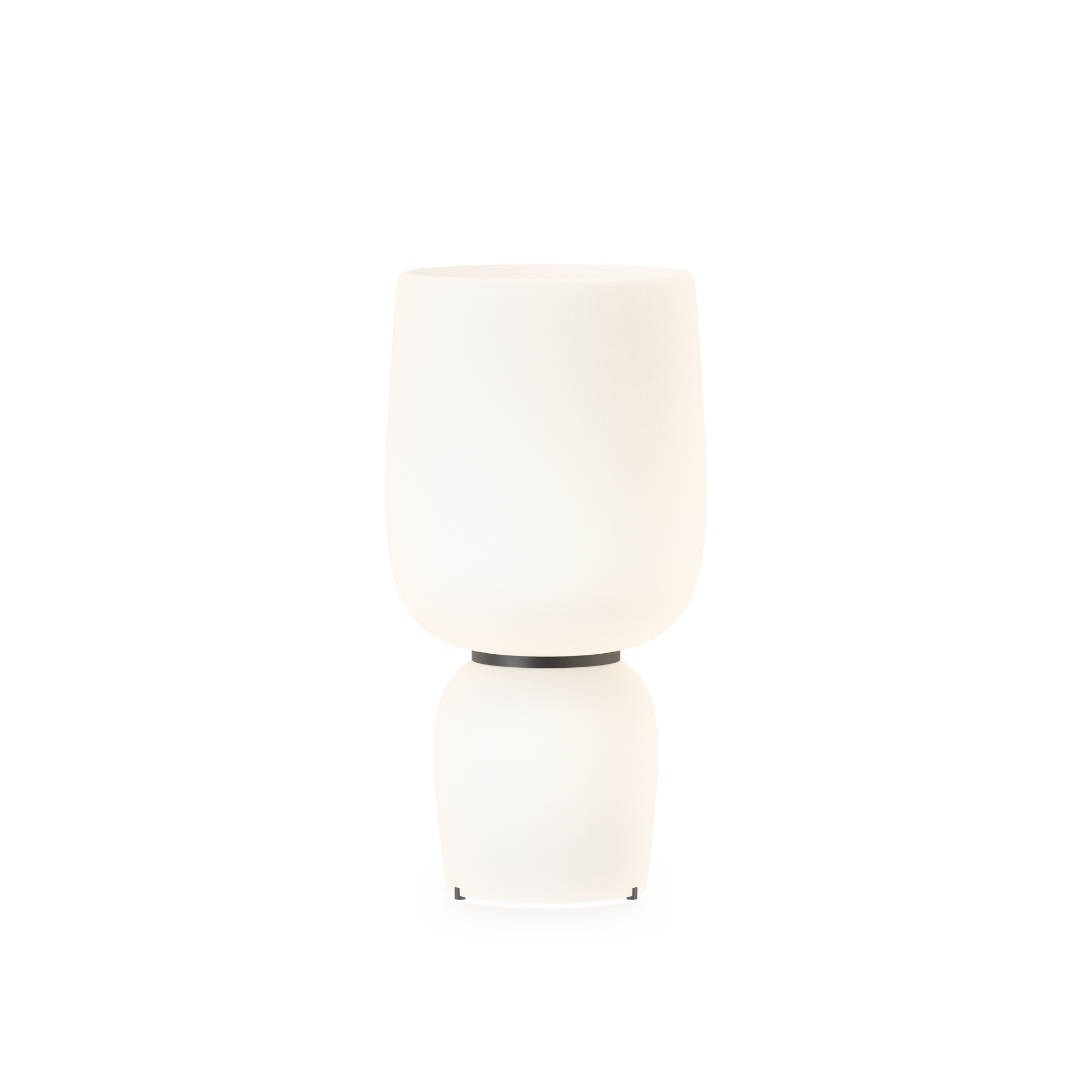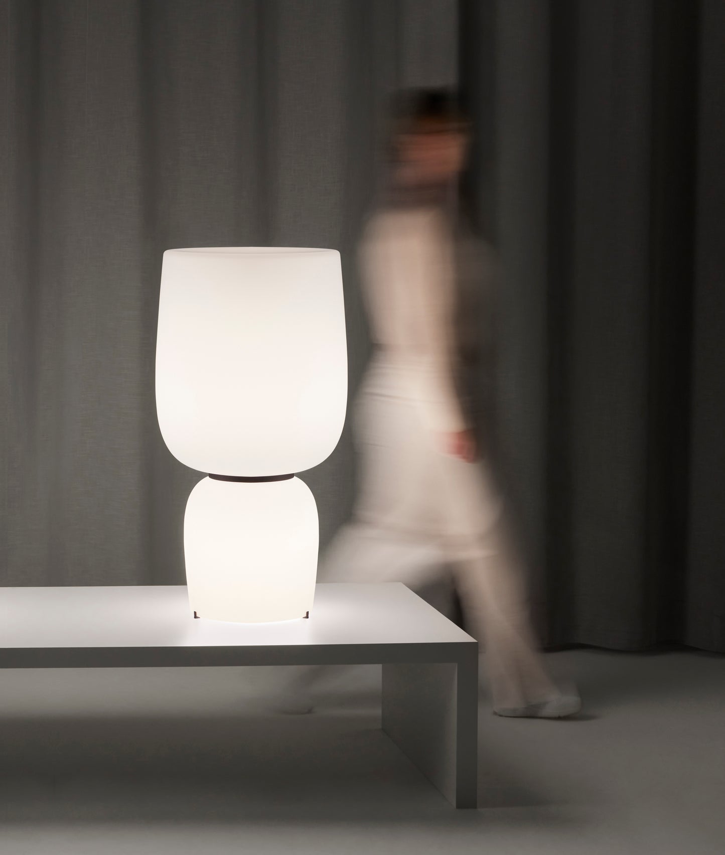 La lampe à poser Ghost revisite, dans une esthétique contemporaine à la fois imposante et éthérée, les grands luminaires qui ornaient autrefois les vestibules et salles de séjour. Elle se compose de deux globes en verre triplex opale soufflé bouche, aux formes bulbeuses, posés l’un sur l’autre, qui diffusent une lumière chaude et accueillante. Un anneau noir, qui permet aussi de régler l’intensité lumineuse pour la version à bouton-poussoir, marque la séparation entre les deux globes, soulignant ainsi leurs courbes sensuelles. Ce luminaire existe en trois tailles et couleurs distinctes (diffuseur blanc, burgundy ou ambre), qui permettent de personnaliser les effets d’éclairage.